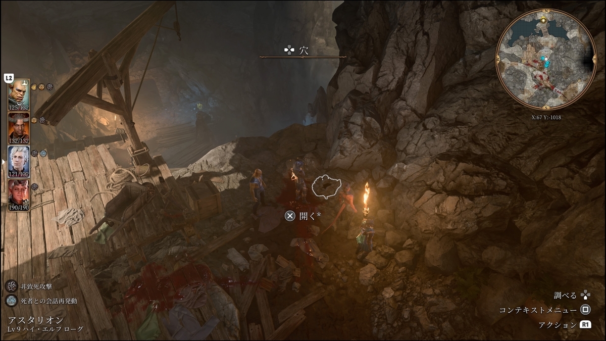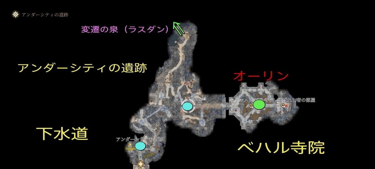 - 開手寺院:バルダーズゲート殺人事件の起点。台所から地下への探索は重要になる「スティルメーカー」「花の鍵」を拾うこと。スティルメーカーは知覚でのみ感知なので発見しにくい。戦闘のあった場所のクレーンが目印