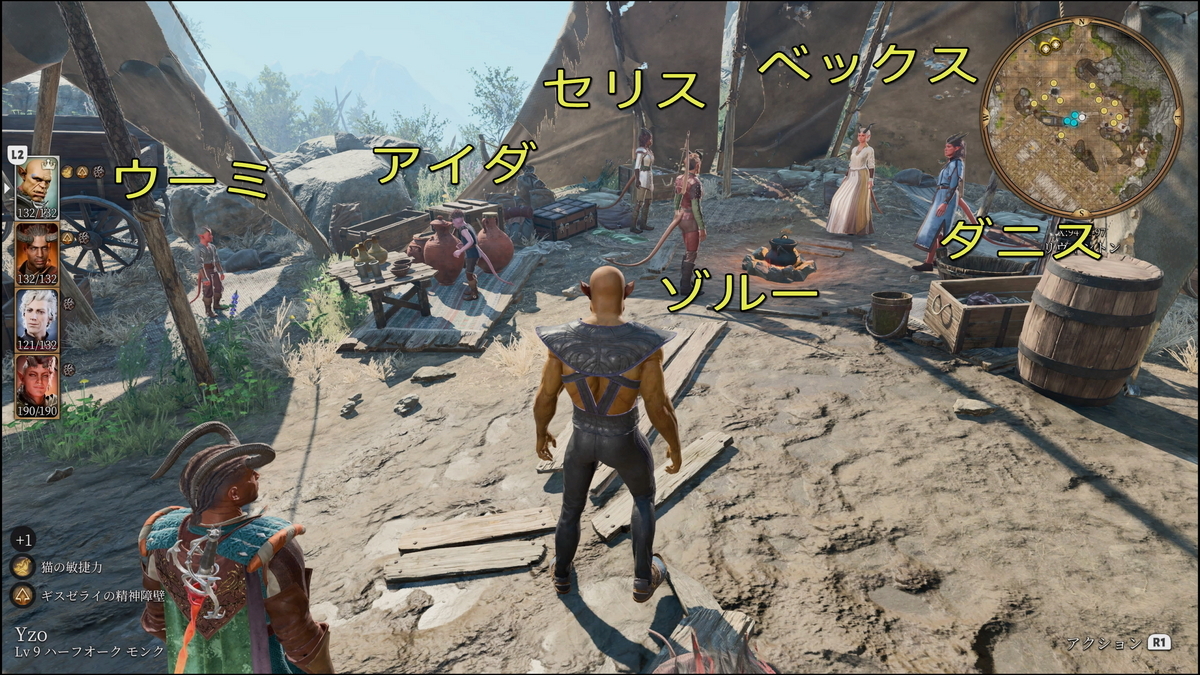- 難民キャンプ:ティーフリングの生き残りがいる。ウーミ・アイダ・ゾルー・セリス・ベックス・ダニスがいることを確認。それぞれ会話をしておこう