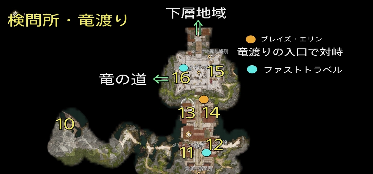 - シャレスの抱擁:イベント多数。バルダーズゲート殺人事件を受注している場合ヴァレリア捜査官が2階にいる。証拠をいくつか集めて話しかけると「竜岩砦への通行証」がもらえる。通行証は竜渡りの巨人兵の右のエリンに渡そう