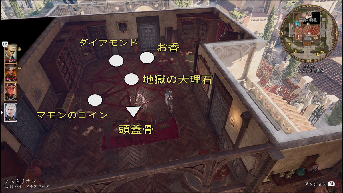 - 悪魔の謝礼:希望の館へとつづく。受付のヘルシックと話すと籠手を入手してほしいと頼まれる(一度上の階に上がり、部屋に入らないと選択肢がでない:要説得)。ジャーナル「オルフェウスを解放する」更新。希望の館へは「ダイアモンド(部屋内宝箱)」「お香(魔紋近くテーブル)」「地獄の大理石(部屋内宝箱)」「頭蓋骨(ヘルシックから購入)」「マモンのコイン(部屋内宝箱)」が必要。各アイテムをヘルシックの部屋の魔紋の正しい位置に置くと(正しく置くと拾えなくなり光った状態になる)希望の館へのポータルが開く。