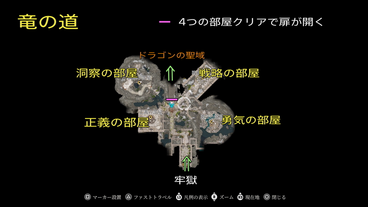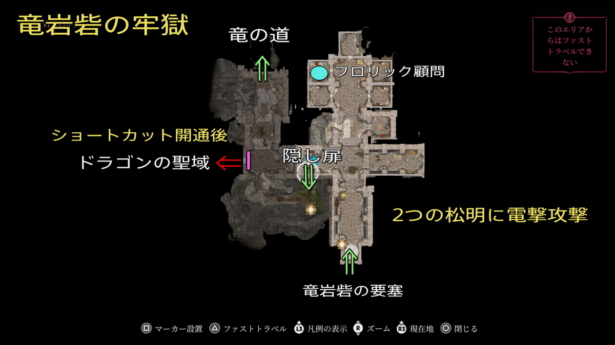 - 牢獄:フロリック顧問が捕らえられているので救出を。ここで救出しておくと、フロリックは最終決戦で協力してくれる。フロリックに不可視化の巻物・魔法をかけて外の検問所(橋)あたりまで行くとイベントが完了する。また、入って左側の松明に電撃属性の魔法なりを与えると隠し扉(初回訪問時はスルーでもいいかも、わりと後半にくるとこ)→竜の道へとつながる。隠し扉は入口入って最初の十字路を左に曲がった左側。ボスのアンサーとは29🏆「緊急着陸」があるので狙おう