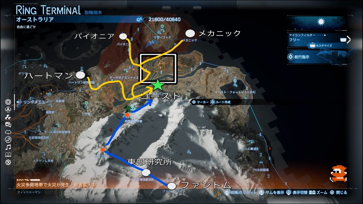 どの時点でゴーストハンターに着手するかで変わってきますが、早い段階で進める場合、▢で示したエリアがの開拓がなされていないと思います。ここの国道が整備されていると尚いい