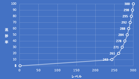 つまり、1→284レベルまでと284→300までが同じ距離感ということになります。