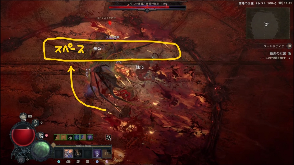 40%を切るとザコを3体召喚してきます。要領はP2と同じ流れ。来るトゲの種類が違うのと、リリスの落とす血のコブが2つに増えるので極力外周に誘導して戦うことで、血のコブを叩きながら飛翔を端に誘導することが出来ます