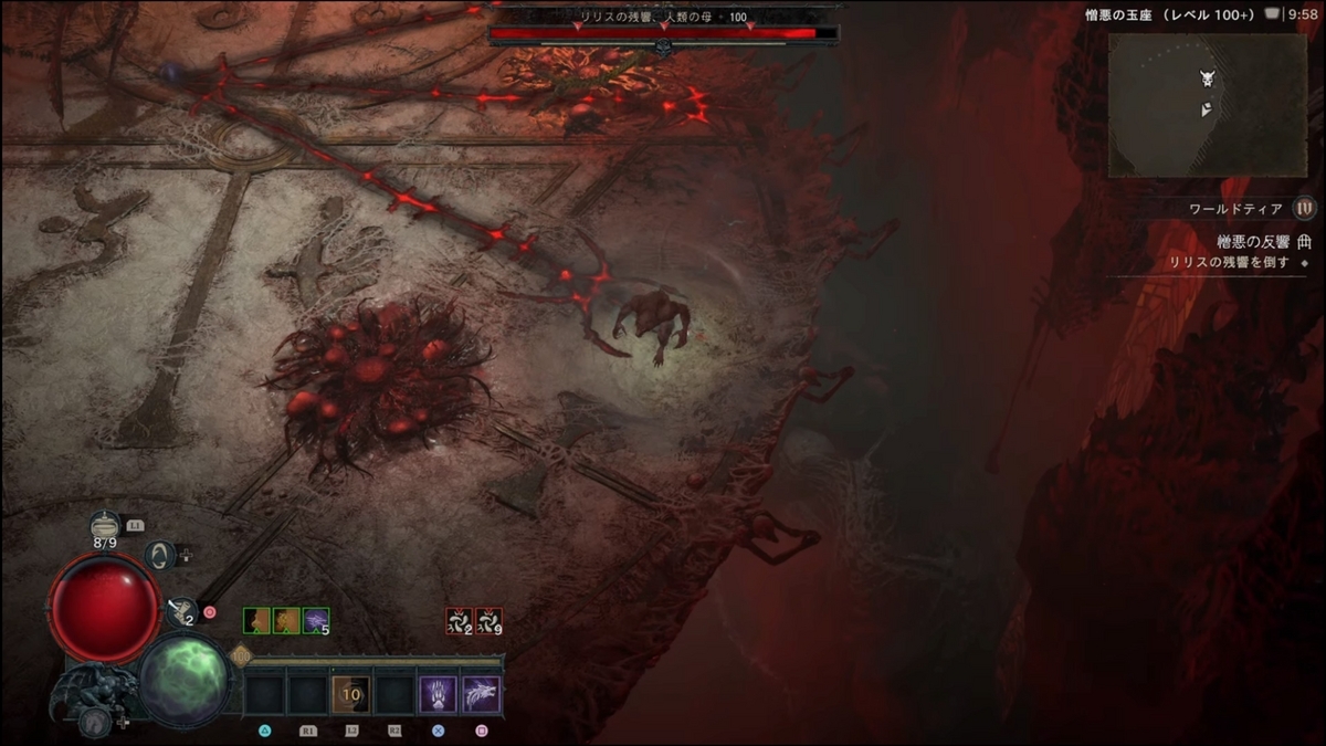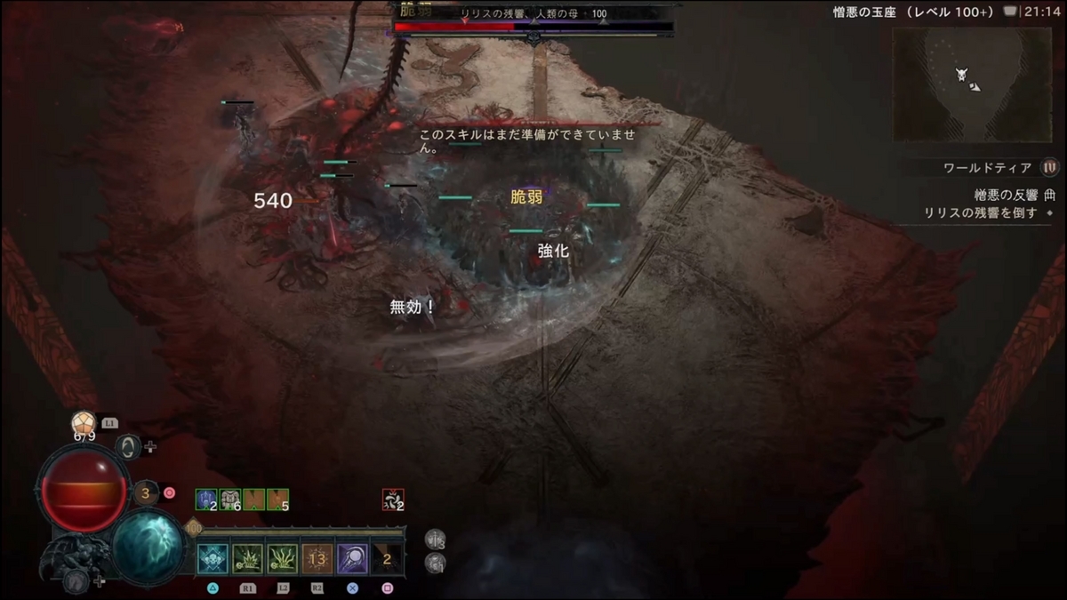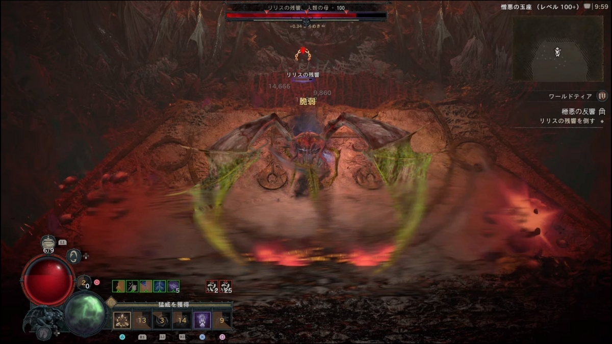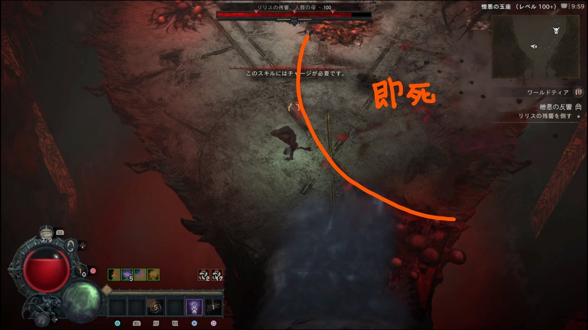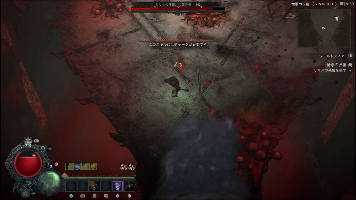 - (【ステップ2で劇的に難易度が下がるパターンがある】開幕、秒数で言うと4秒程度(厳密には後半開幕リリス登場からフィールド全体に血のコブが各所に湧く前、湧く動作に入ってしまってもNG)で約6000万ダメージ、リリスHP15~20%以上削ると以降火の玉が出現しなくなります。これにより劇的にクリアしやすくなりますが、初速で6000万ダメージ出すのに、瀉血(激怒の心臓:クリダメ以降溜め込み15%ダメージアップ)の秒数が2.0~2.1(2.3ではダメだった)のもので2回ダメージ与えるか、4秒のもので初手に6000万与えるなど心臓の厳選が必要になる。):ネクロマンサー4秒瀉血・ドルイド竜巻ビルドでは2秒瀉血(もしくは3.3秒でもいけた)でスキップは確認していますが、共にPS5の場合処理の問題なのか、ダメージがうまく反映されない時もあるように感じます