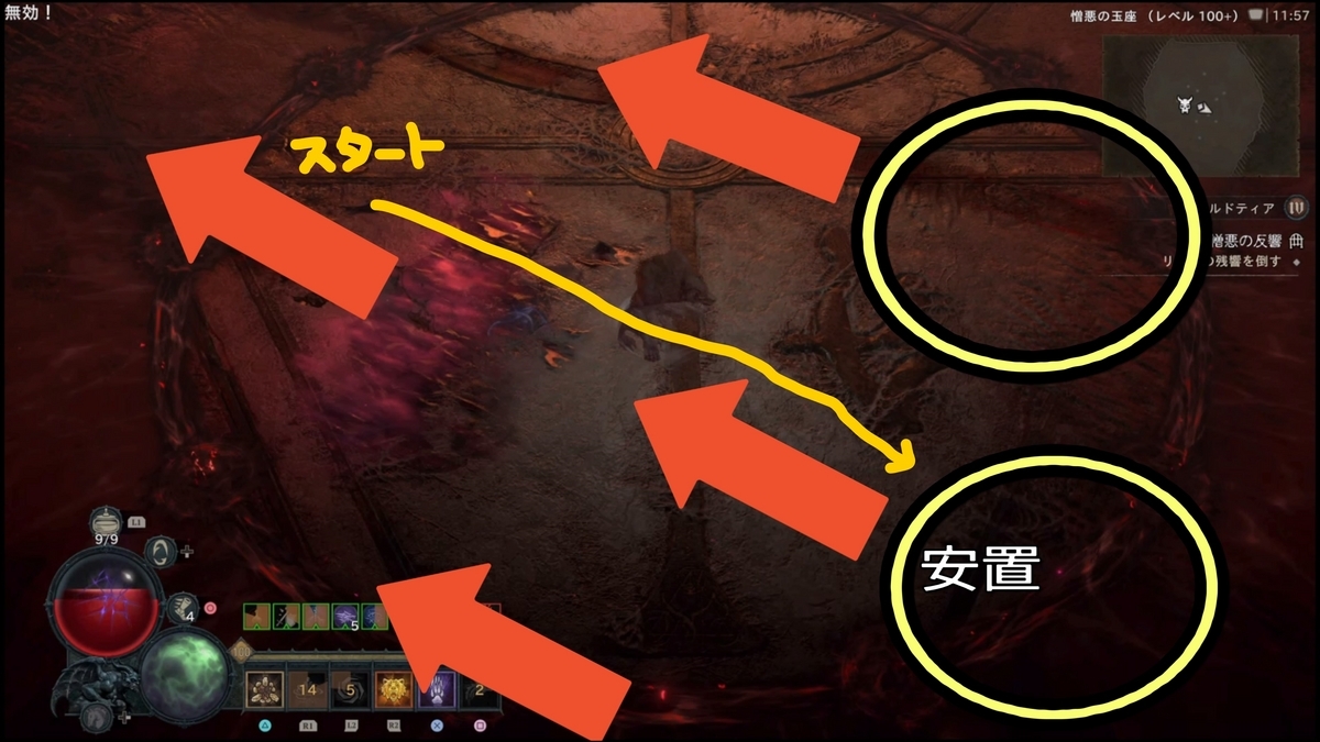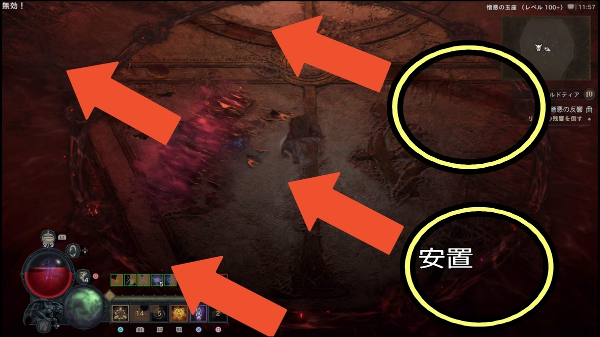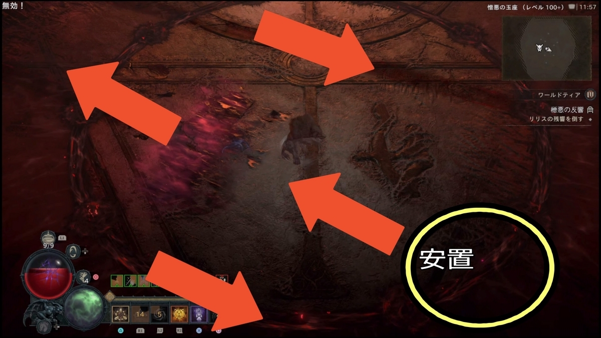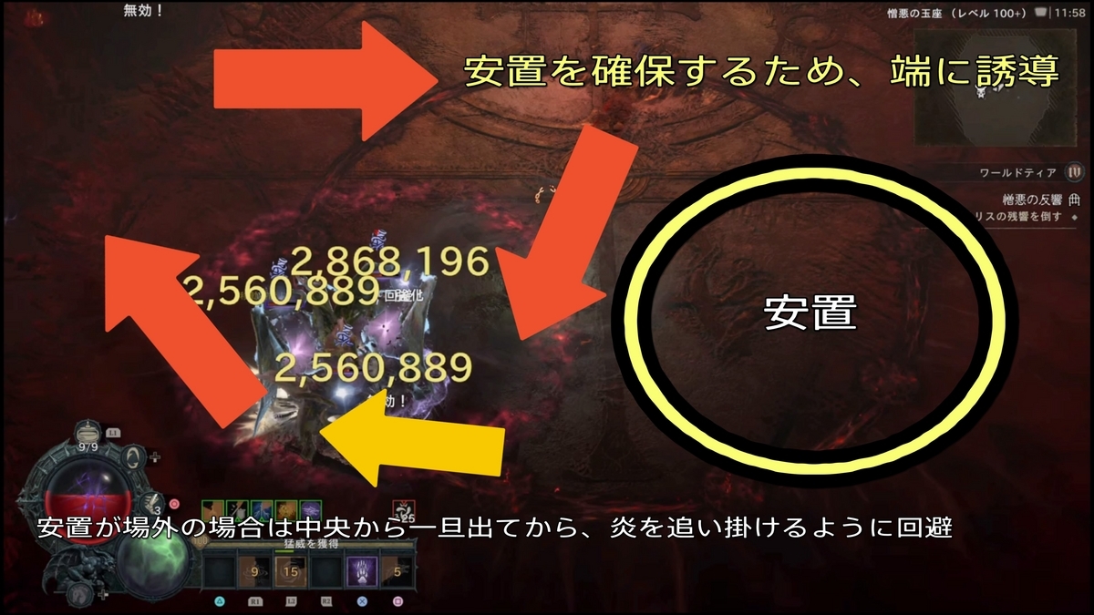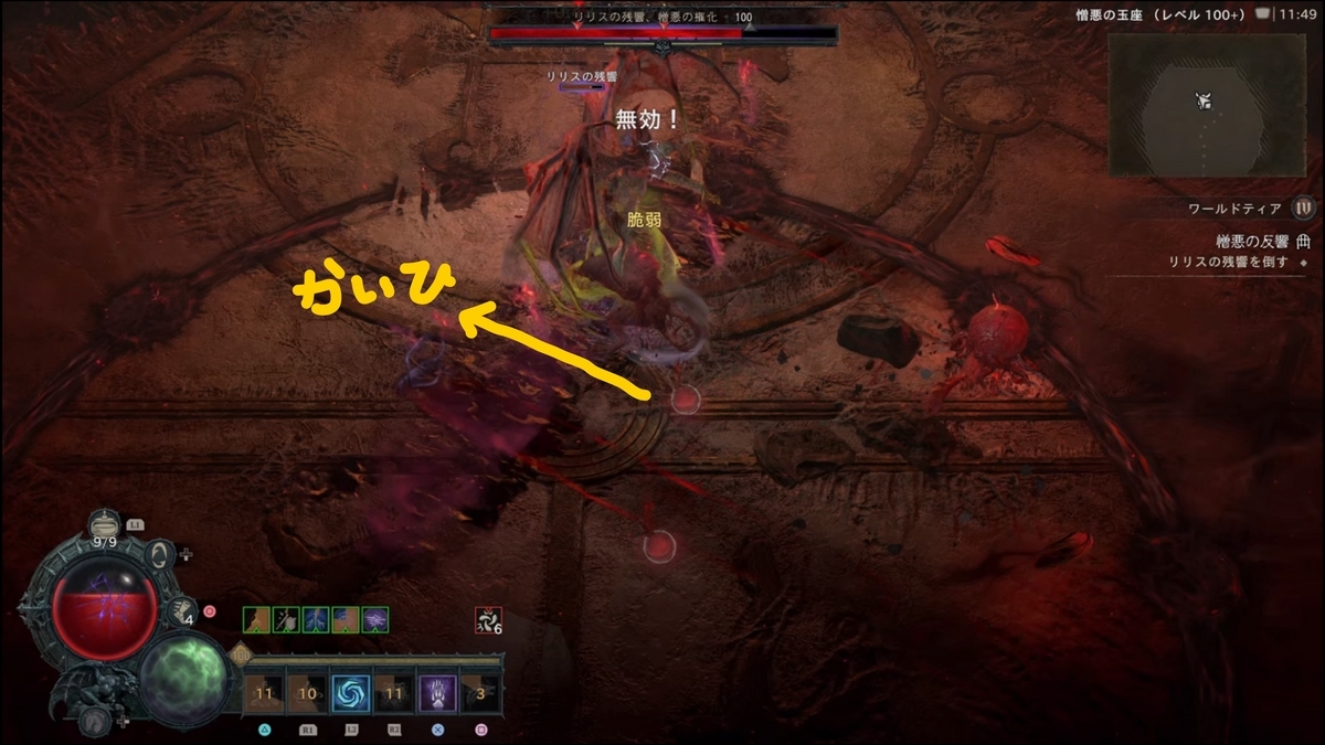 - (【ステップ2で劇的に難易度が下がるパターンがある】開幕、秒数で言うと4秒程度(厳密には後半開幕リリス登場からフィールド全体に血のコブが各所に湧く前、湧く動作に入ってしまってもNG)で約6000万ダメージ、リリスHP15~20%以上削ると以降火の玉が出現しなくなります。これにより劇的にクリアしやすくなりますが、初速で6000万ダメージ出すのに、瀉血(激怒の心臓:クリダメ以降溜め込み15%ダメージアップ)の秒数が2.0~2.1(2.3ではダメだった)のもので2回ダメージ与えるか、4秒のもので初手に6000万与えるなど心臓の厳選が必要になる。):ネクロマンサー4秒瀉血・ドルイド竜巻ビルドでは2秒瀉血(もしくは3.3秒でもいけた)でスキップは確認していますが、共にPS5の場合処理の問題なのか、ダメージがうまく反映されない時もあるように感じます