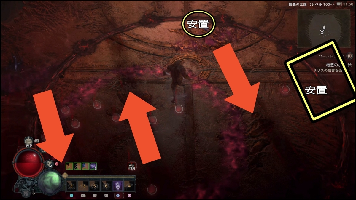 - どのケースにおいても端から反対方面に駆け込めば安置があるが、移動速度150%くらいは欲しい※通常ブーツとアミュレット2か所に上の方の数値を引くと25%くらいつけれるので、2つで50%、ステータス上150%となる。ブーツに移動系の化身をつけてもいい
