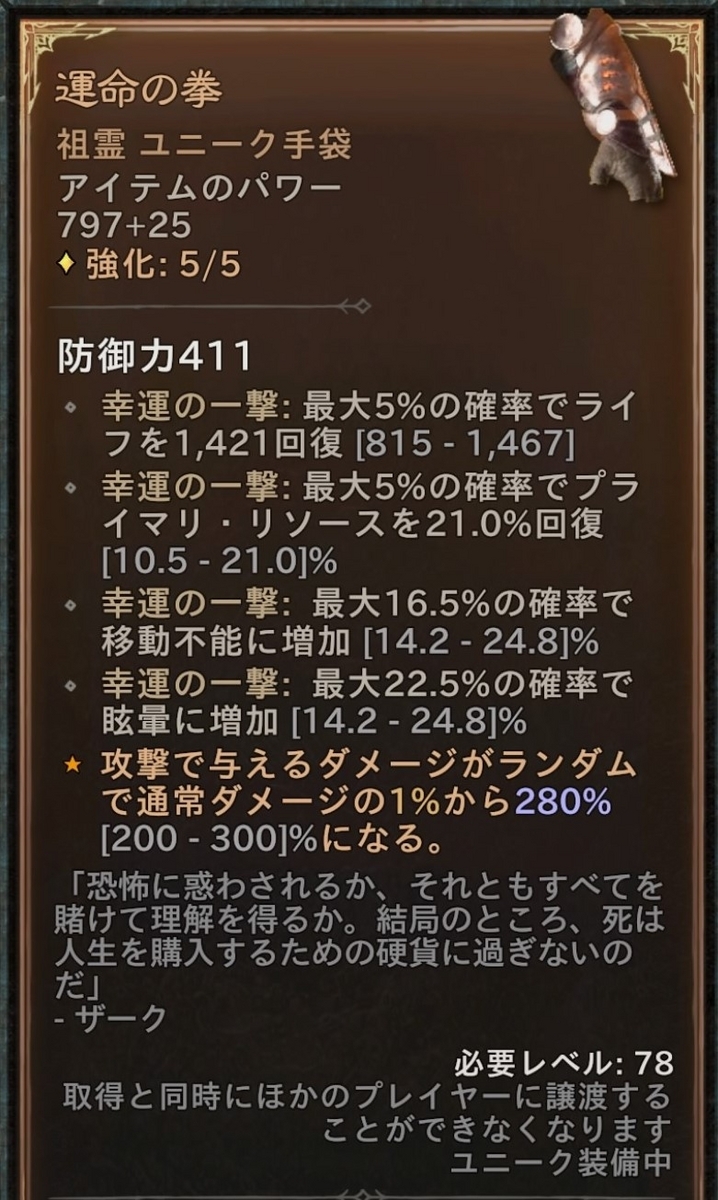 手袋のユニークは替えが効かない、足のユニークも操作障害持続時間が付くので代用は難しいかもしれません。操作障害持続時間はスタミナゲージの削りに影響:火力とのバランス的にスタミナージの削りが速いのならズボンは変更ありえる。
