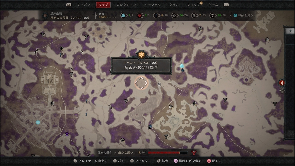 破砕山脈のエリアが紫のヘルタイドのような地域になっています。エリアの敵を倒すと、各種トークンを落とす。