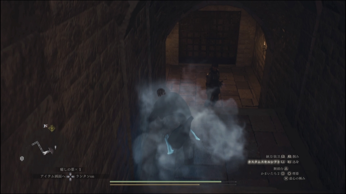 衛兵が近づいてくるのでR2で担ぎ上げて、来た道を戻りもう1人の衛兵を越えて曲がったあたりで降ろす
