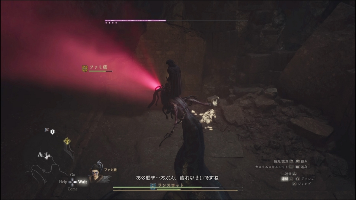 開幕したら、メドゥーサの背中辺りからR2で掴まり、頭部へと這い上がっていく。這い上がり中ジャンプ→R2で登って行ってもいい。