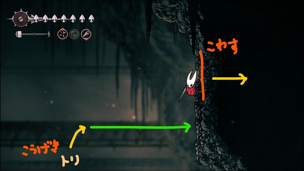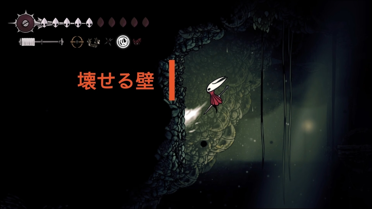 記憶庫の東端の隠し通路は少し高い場所にあるので、敵を踏みつけて二段ジャンプで壁に張り付き壁を壊します