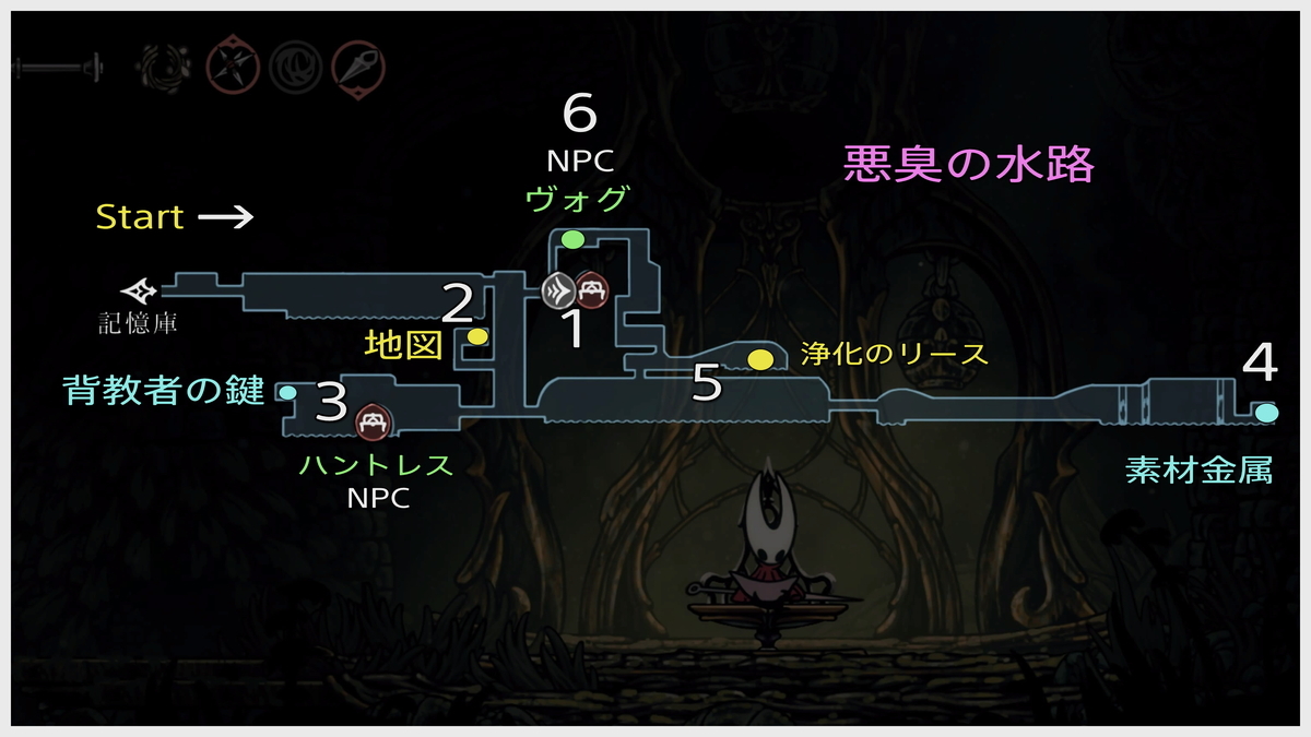 中に入るとトゲトゲ床が敷き詰められているのでそこに注意して奥まで進むと上部へと上がっていけます。上部の左側に隠し通路があり、駅とイスとのショートカットにもなるので開通しておきましょう