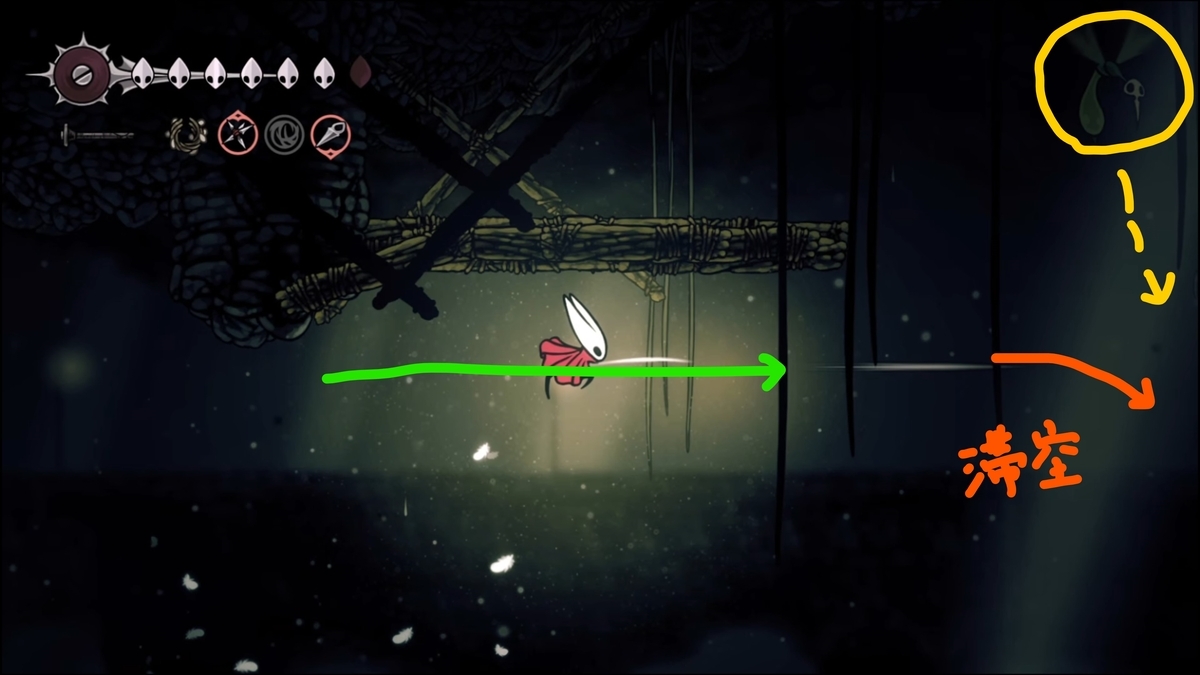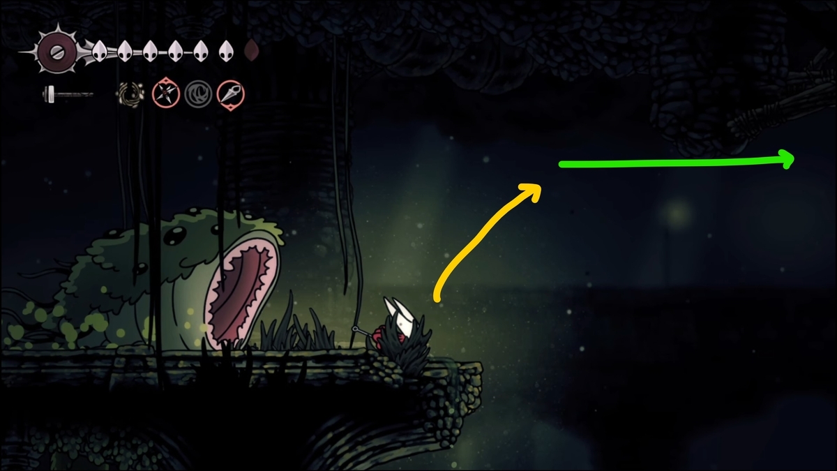 キーとなる敵は緑の毒液を3つ吐いてくる飛行系の敵です。まずこの敵を誘導するために手前の足場(このエリアの最初の足場)から二段ジャンプ+銛で接敵範囲に入ります