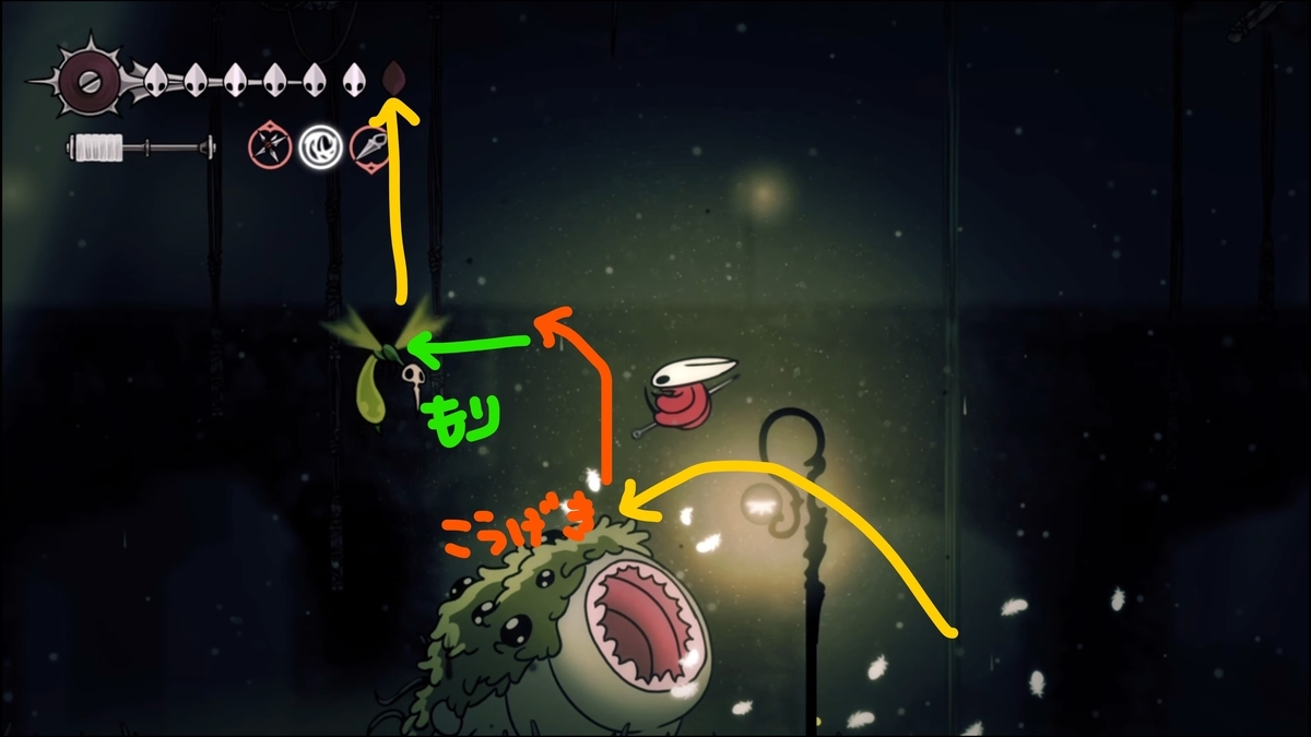 すると、上の飛行敵が寄ってきて、下にはデカ緑の状態になる。この2体を利用し小さな足場か、ツタに捕まり上へ行けます