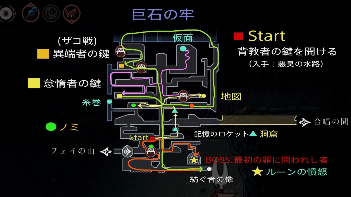 背教者の鍵は巨石の牢にある鍵を開け、仮面の破片などを入手できます。下の鍵を開け二段ジャンプで進んだ先にはボス「最初の罪に問われし者」と戦闘になります。撃破報酬はスキル技「ルーンの憤怒」