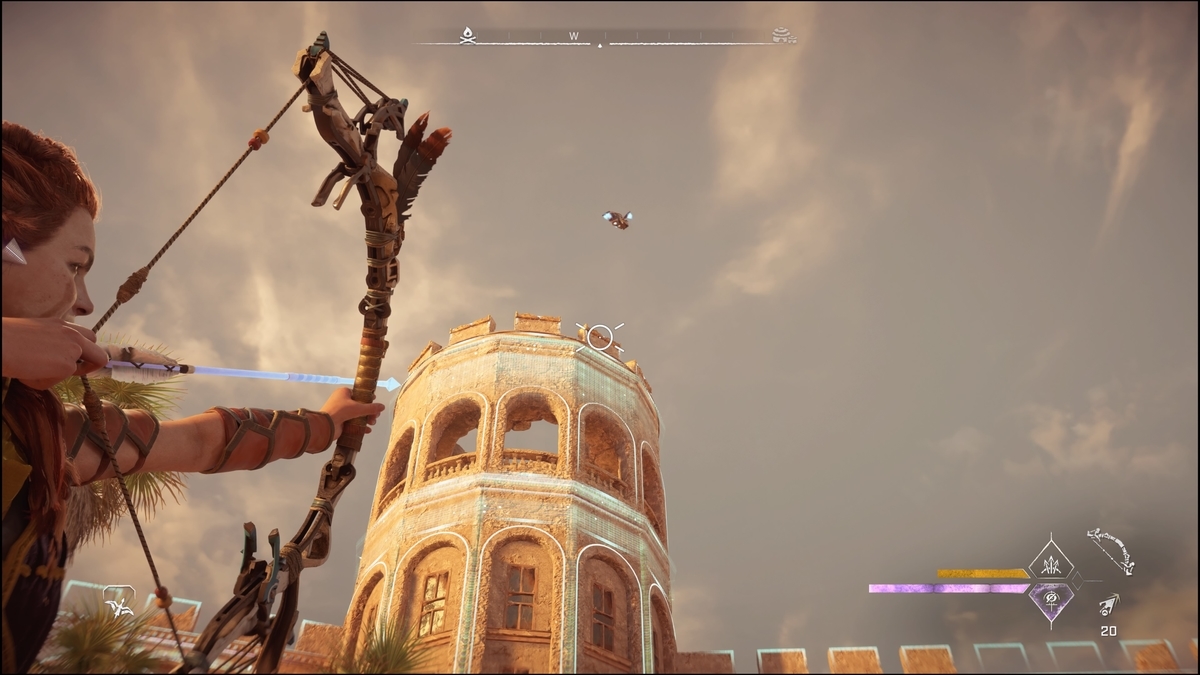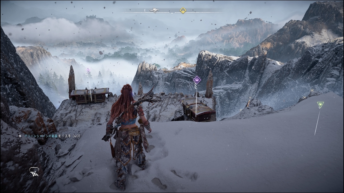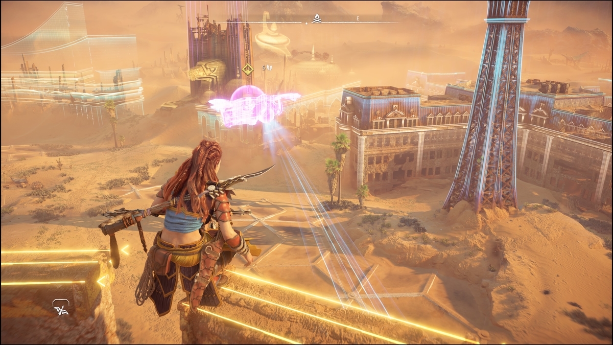 東向き、この位置がやり易い。グラップルポイントと背景で確認してほしい。正面にプロジェクションマッピングのようなタワー