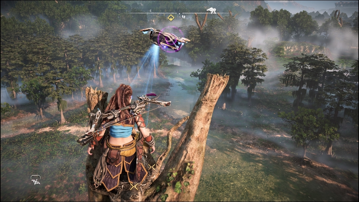 倒木から木々に飛び移っていく。綱渡りや滑空で何回か飛び移った先、拡大画像がジャンプ位置