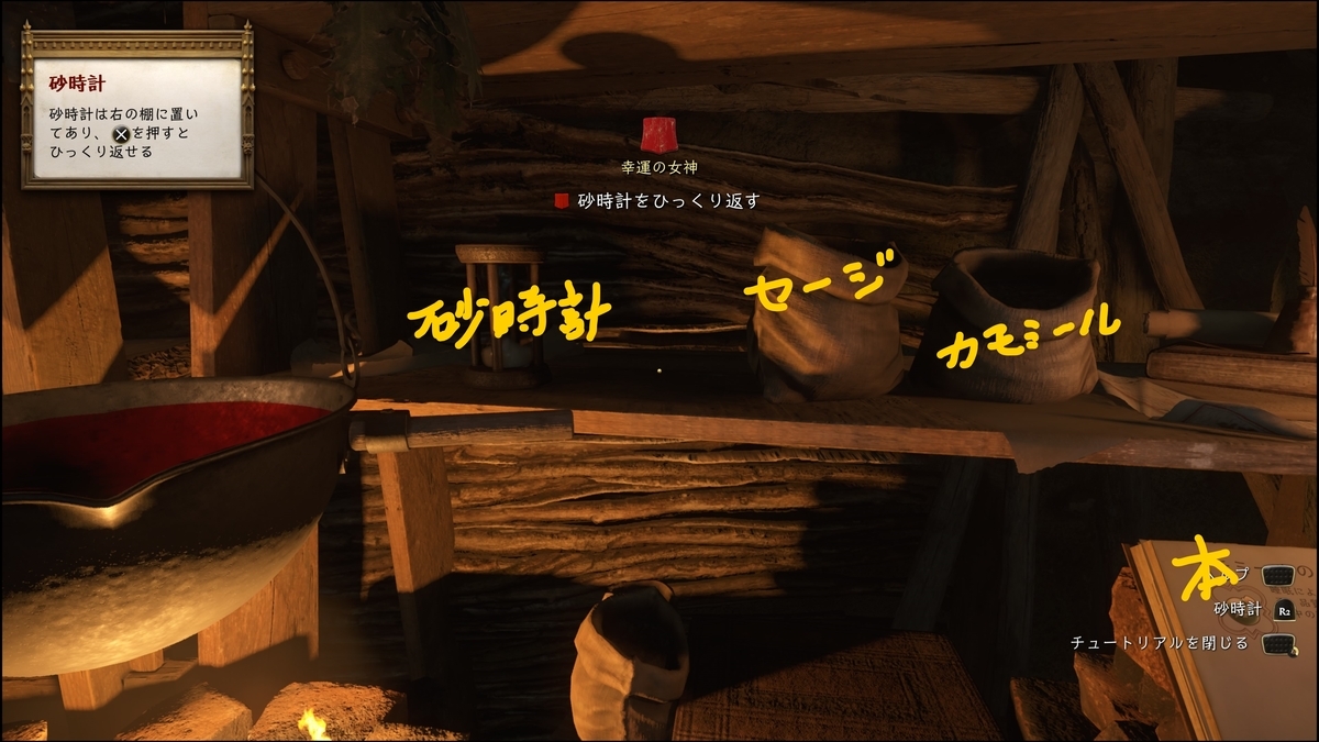 - イラクサを1掴み大釜に加え、砂時計を2回分茹でる(大釜を選択すると火に掛けます、そこから砂時計2回分)