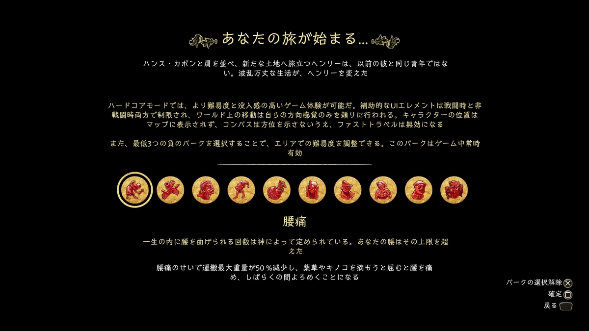 移動・サバイバル・戦闘の難易度が上がる。また、ハードコアモードではゲーム開始時に3つ以上の負のパークを選ばなければなりません。