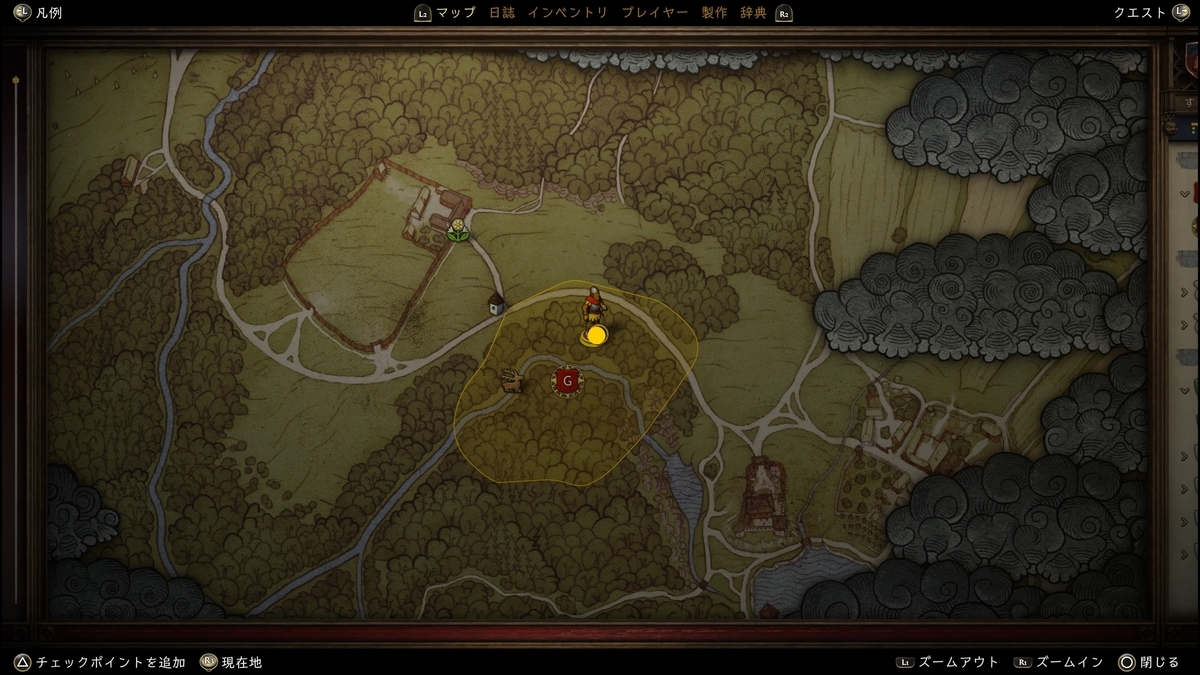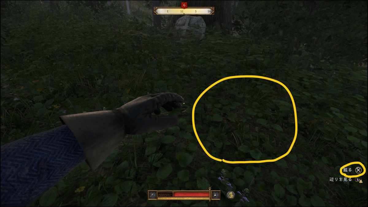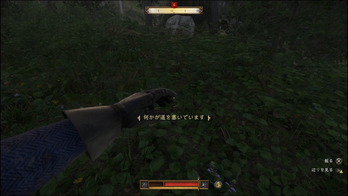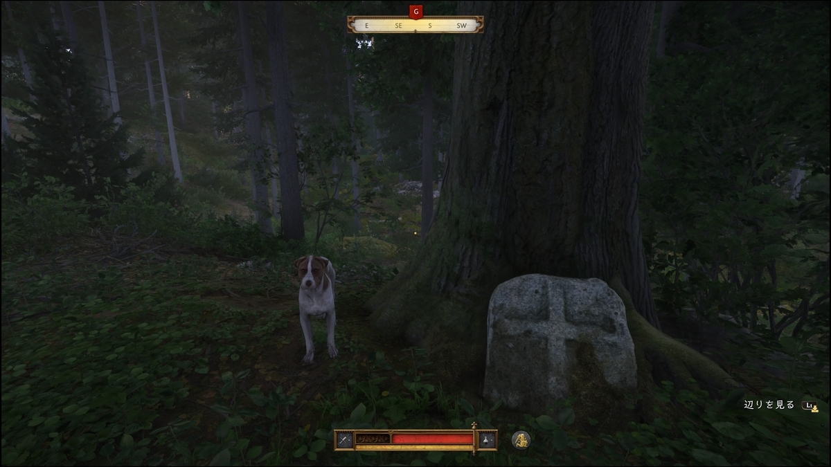 十字の石が目印。近くに行くと右下に「辺りを見る」が表示される