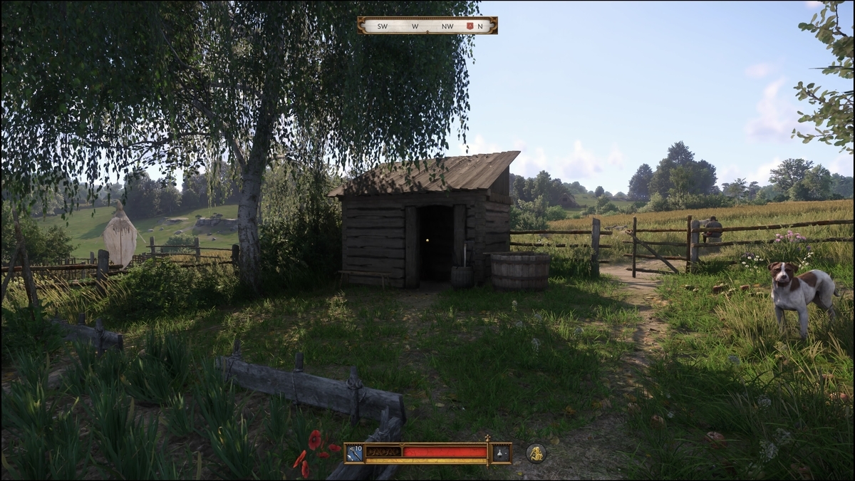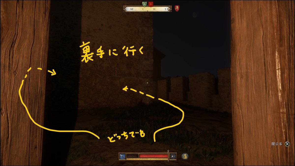 小屋から出て東側へ移動する。目の前の建物の裏手に出たい。兵士の状態で行きやすい方から向かう。左ルートは巡回はいるものの、倒さず行ける。右ルートならノックダウンで近い。