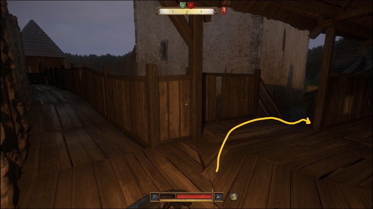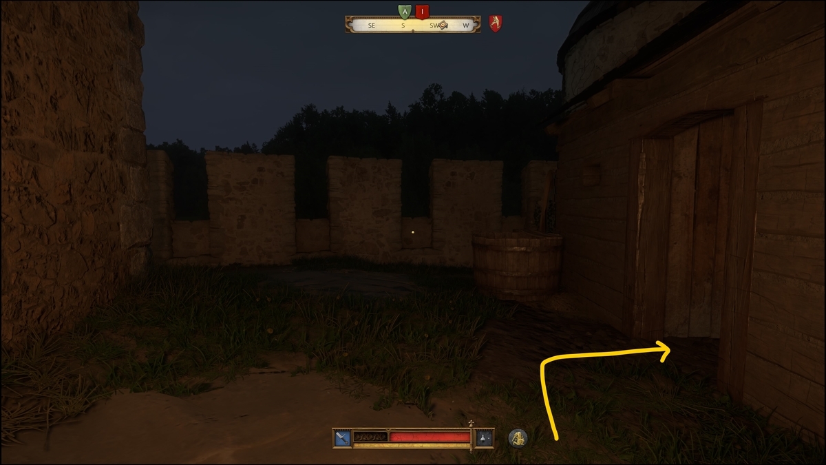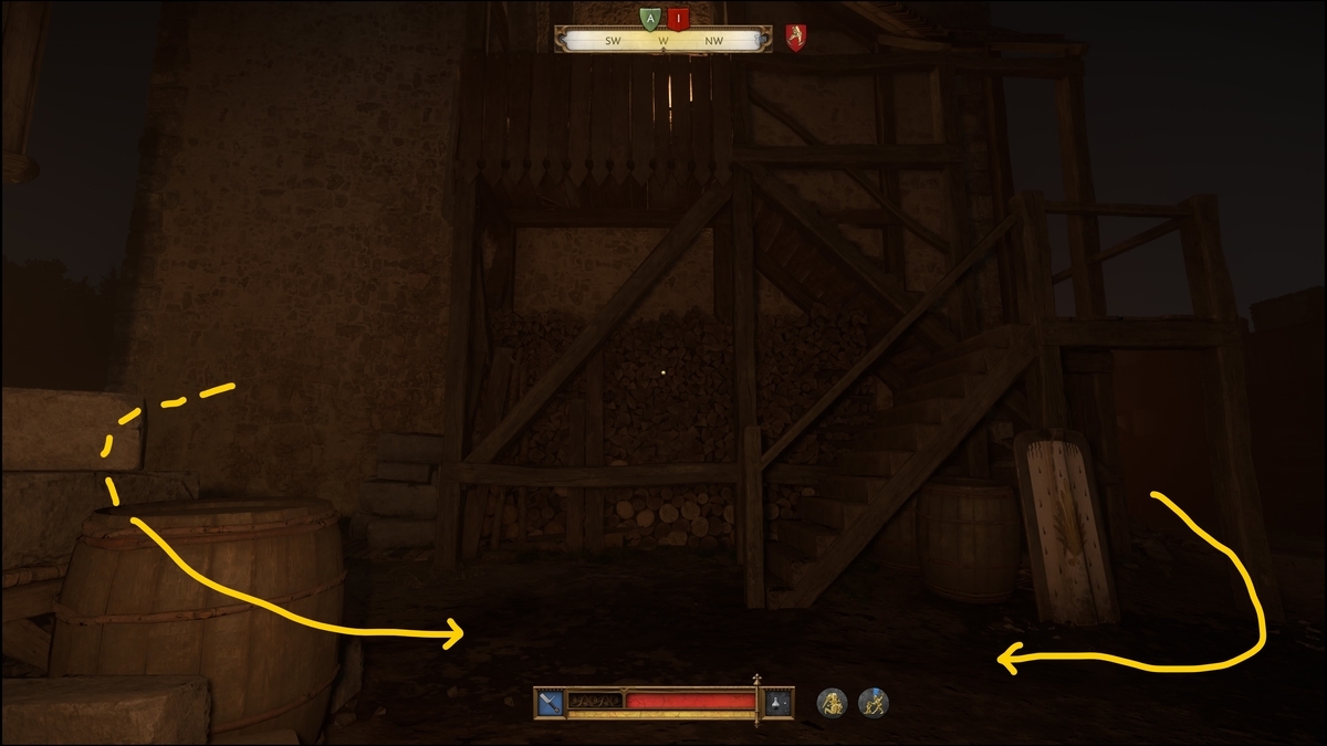 要塞の北にある馬小屋へ向かう。兵士を殺さず、隠密行動で、石投げを駆使して進んでいく。