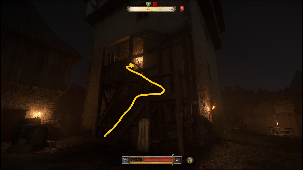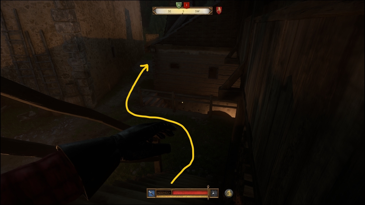 東側に到達したら振り返り、背の高い建物の外階段を上がり侵入する(扉を閉める、開けておくと兵士が不審に思う)