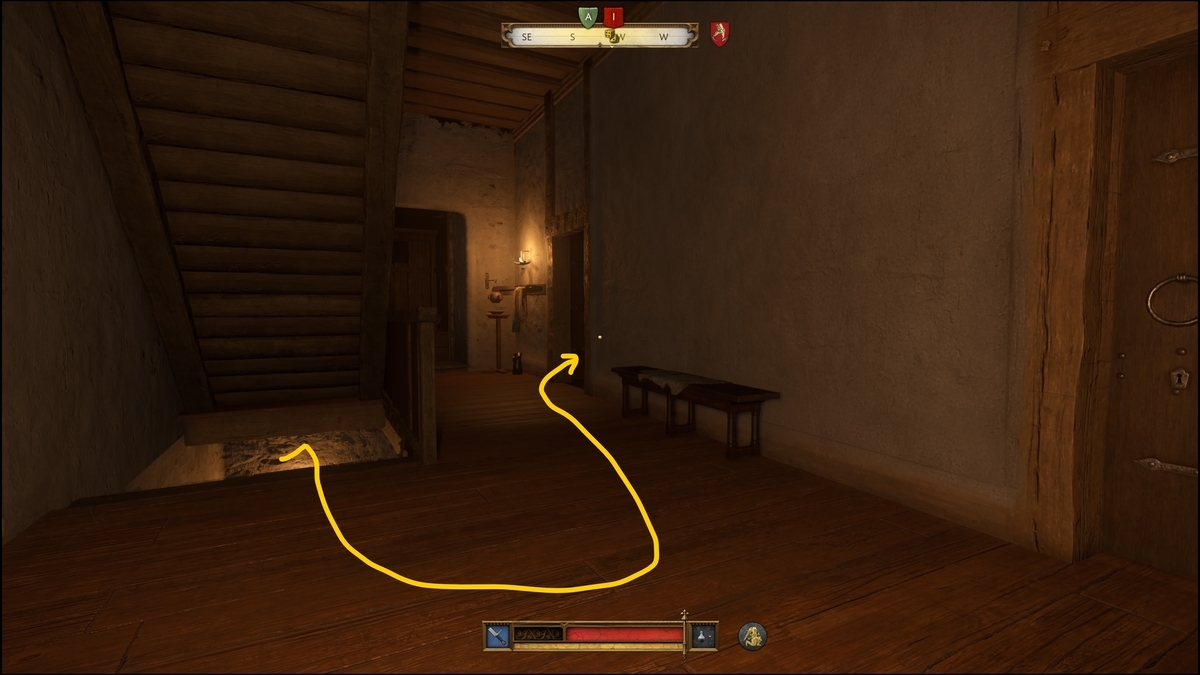 中に入ったら、階段を上がると兵士がいる。女性と口論した後降りてくるので階下で隠れてやり過ごしてから進む