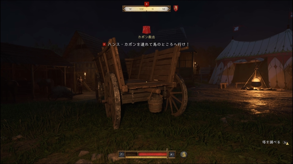 建物から外に出て、兵士が移動したタイミングで北の門をくぐり左に行くと荷馬車があるのでその陰で松明で合図を送る(物理的に松明を掲げる)
