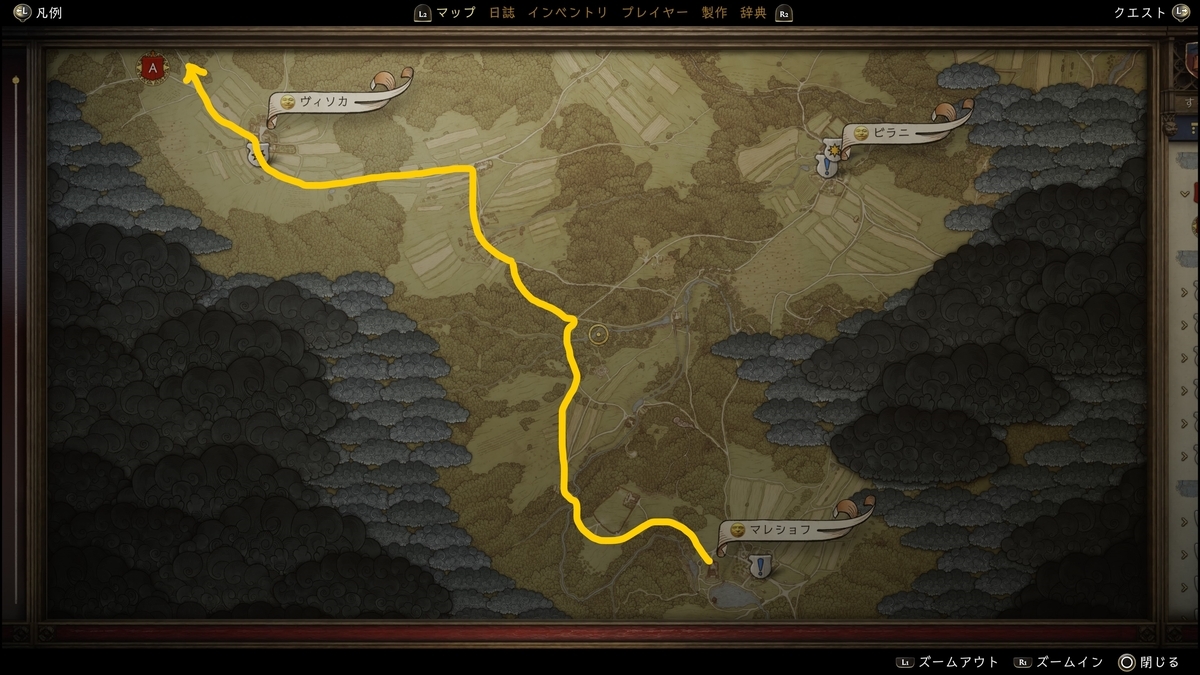 現在地はマレショフです。ハードコアの場合マレショフの砦から左を進み、道なりにずーっと進みます。絶えず分岐を左に進み、焼き払われたメゾレス村を抜けたT字路も左へ進むとヴィソカに到着する。