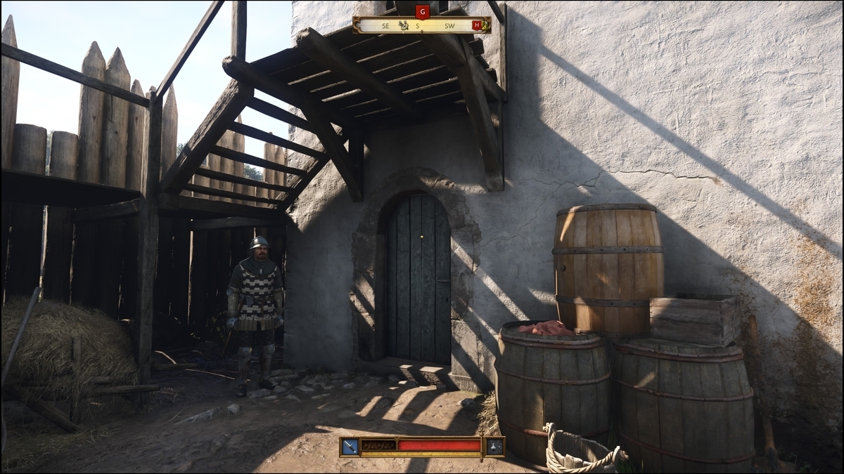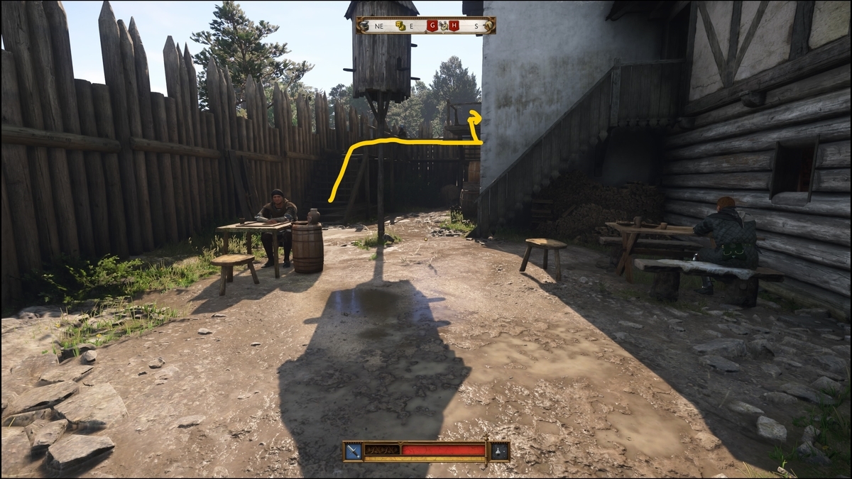 ダイステーブルの近くの扉からキッチンに入り奥の扉を開けると、衛兵の後ろに出られる。物音に気付いた衛兵が捜索を開始するので、キッチンの方まで誘導する。ぐるっと引き返し速攻で扉を開け、ドアを閉める