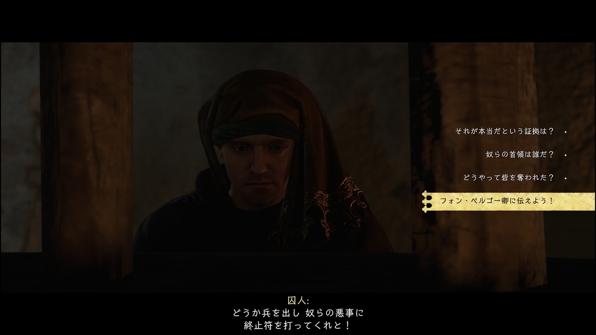 入ってすぐの囚人と話す。「フォン・ベルゴー卿に伝えよう!」選択(トロフィー解除)。他の選択でもトロフィーが取得できると思いますが、評価の下がるものがあります