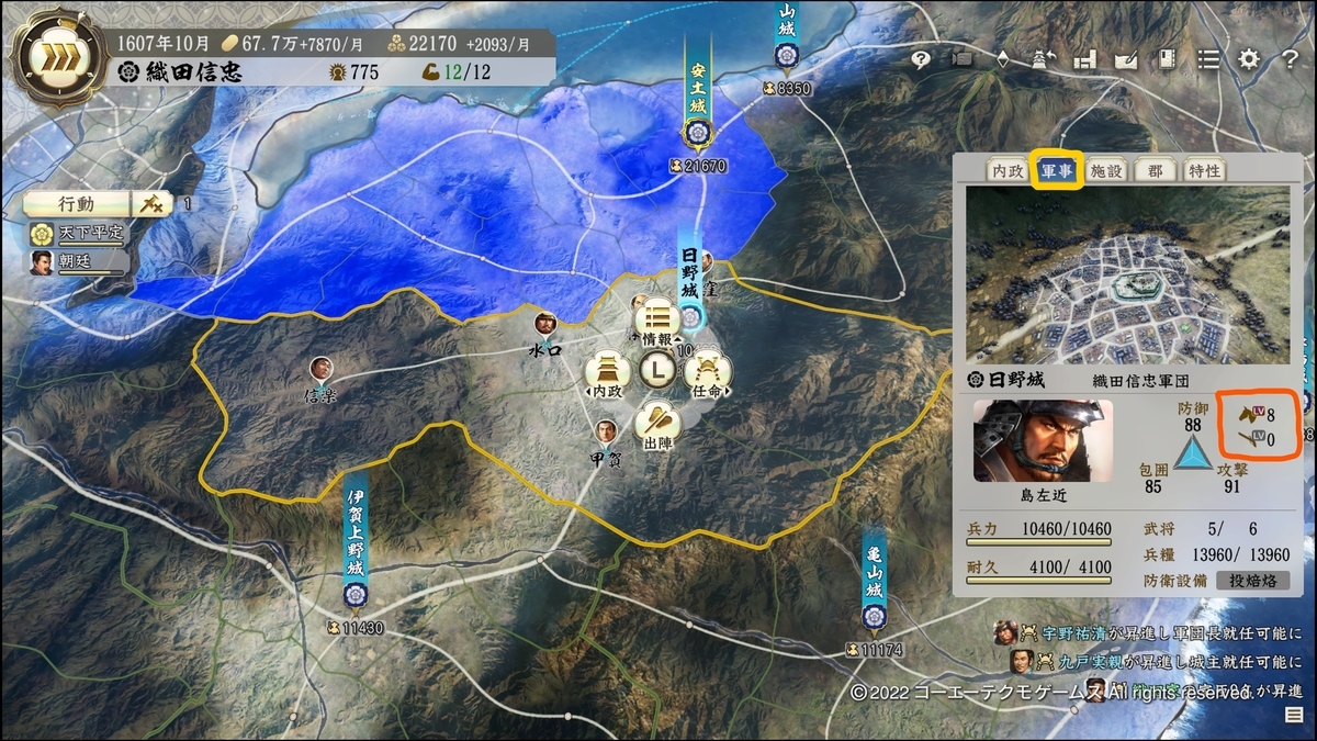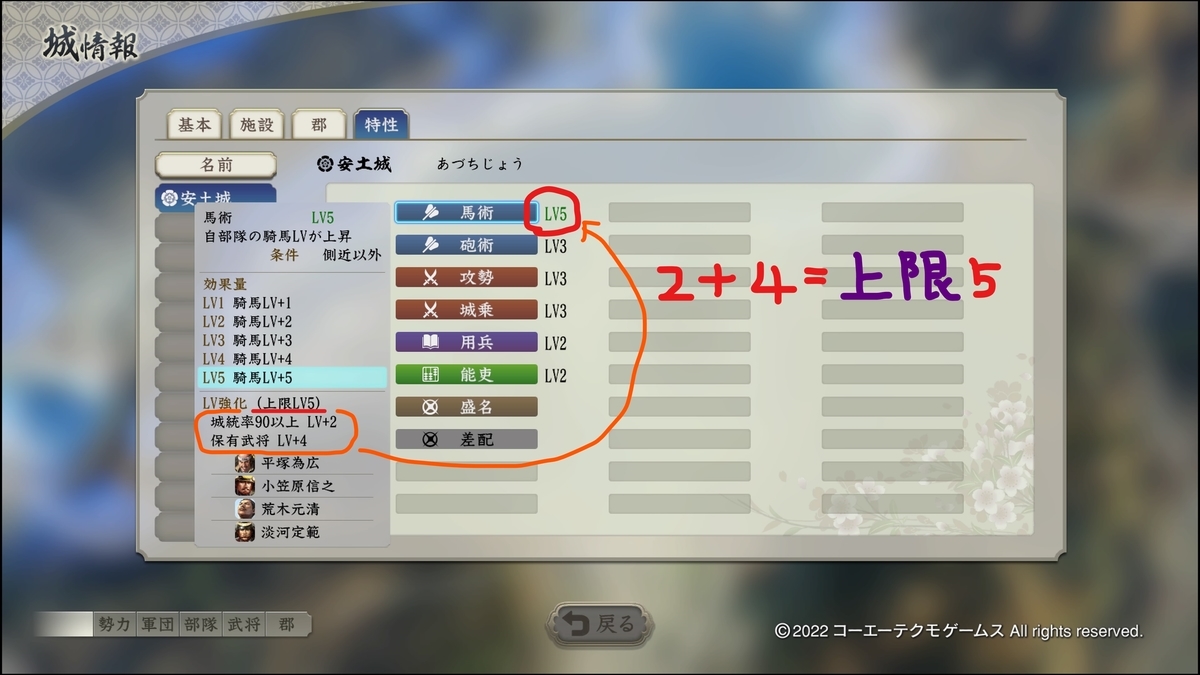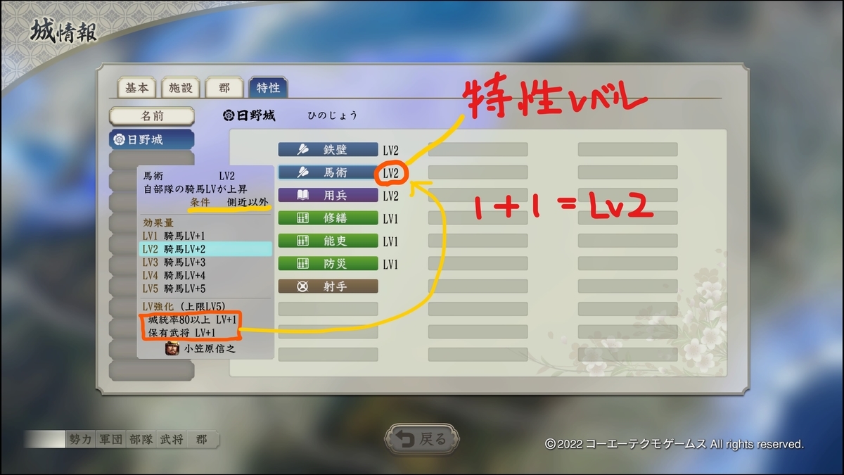 1.下の画像の特性のレベルはその城に配属されている武将の特性の合計です。施設や政策のボーナスは含まれていません。