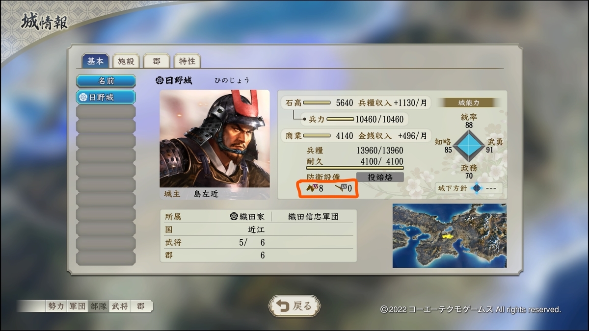小さいですが総レベルが上が馬術8・下が鉄砲0と書いてありますね。もしくは城にカーソル>情報>城情報でも見ることが出来ます
