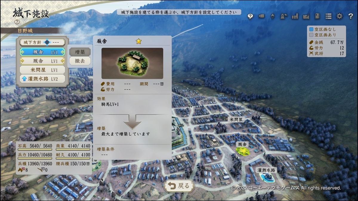 厩舎1つにつき馬術+1されます。重要なのは重複するということ。厩舎を2つ作れば馬術+2ということです。ただ城下施設には他にも有用な施設があるので計画的に