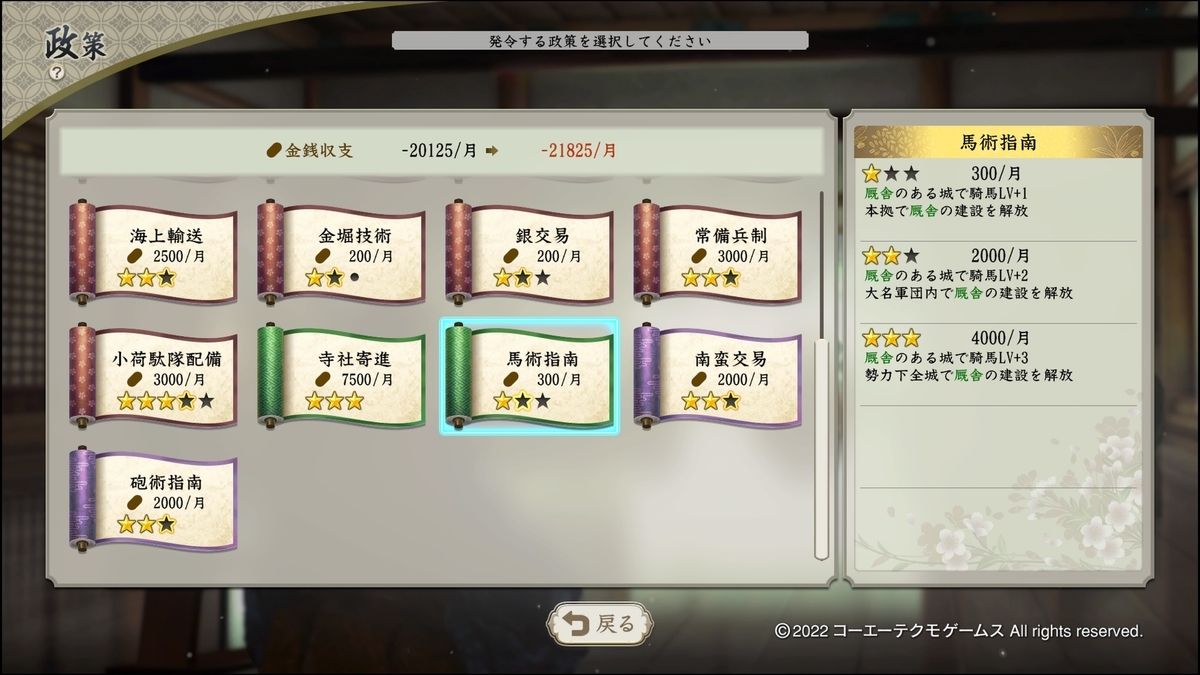 忘れてはいけないのが、必ず1つは建設することです。厩舎が無いと政策の馬術ボーナスが発生しないのです。