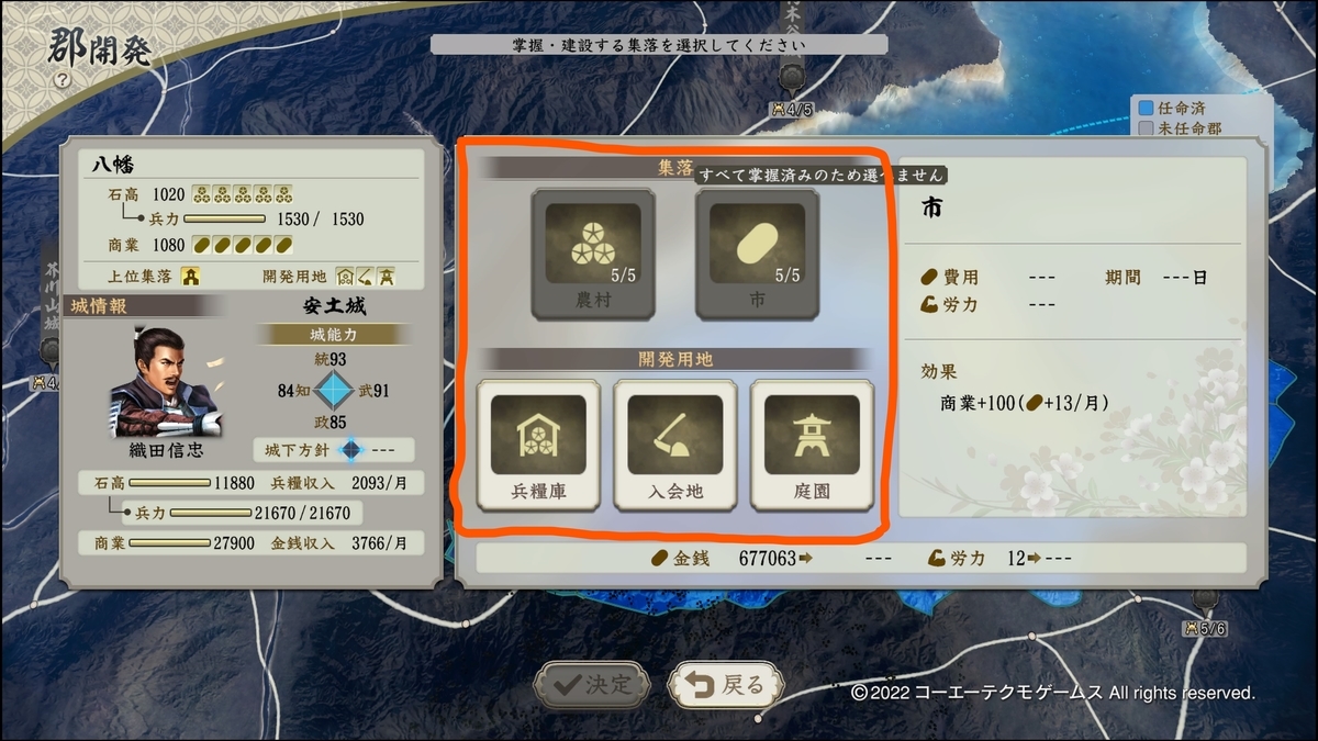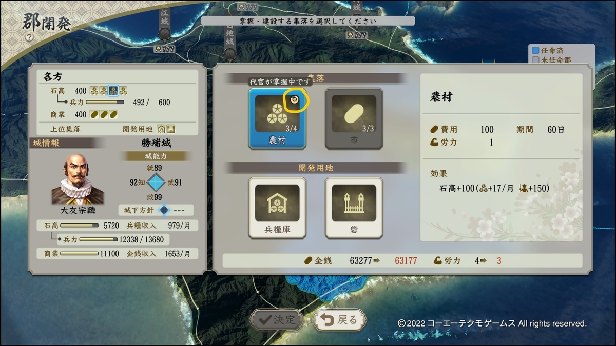 上位集落は、大名城なら代官に命じて郡を開発・空いてる開発用地に何でもいいので埋めていけば上位集落の依頼が来ます(画像オレンジ枠をどんどん開発していく)。