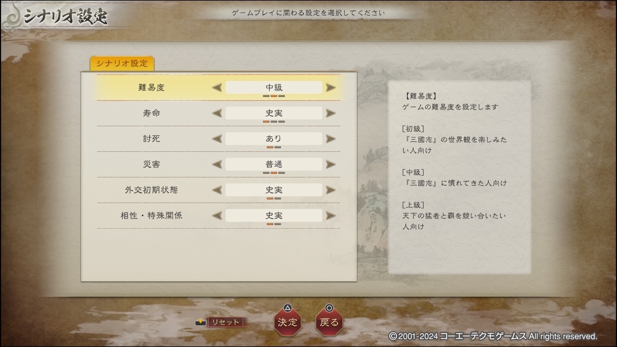 シナリオまたは武将選択時に行う「シナリオ設定」はゲーム開始後変更できません。特に難易度は途中で変えられないので自身に合ったものを選びましょう