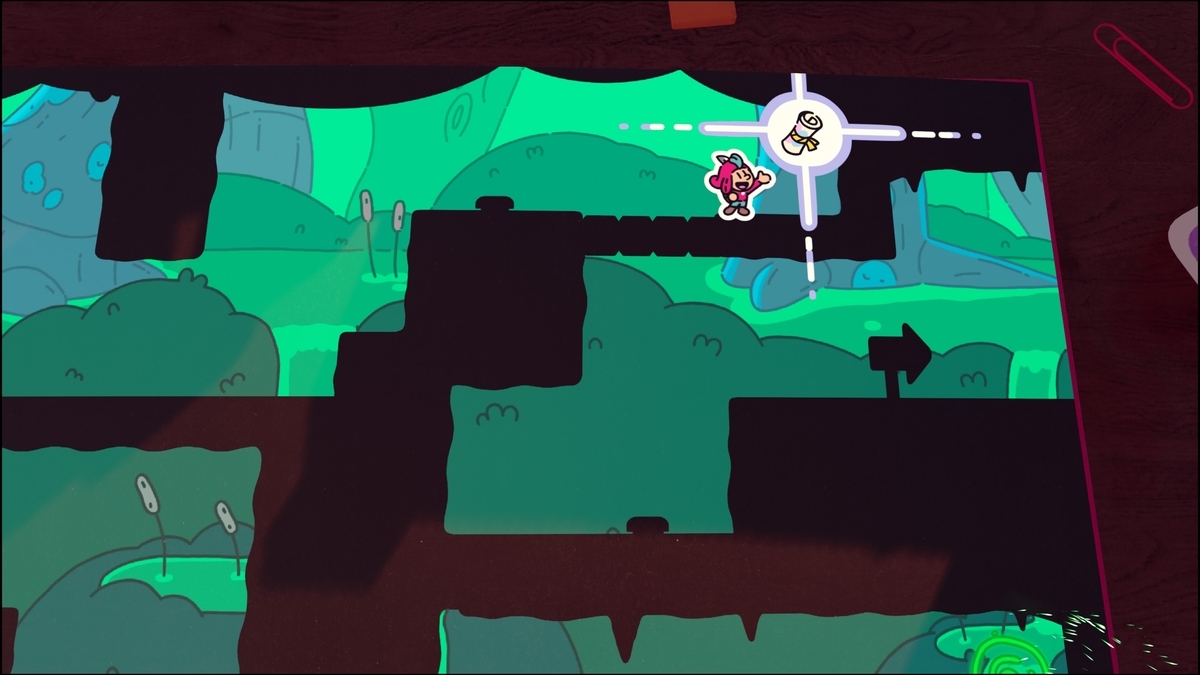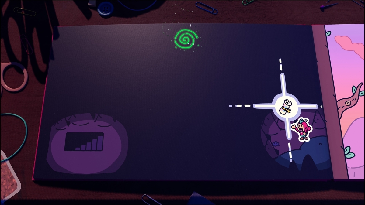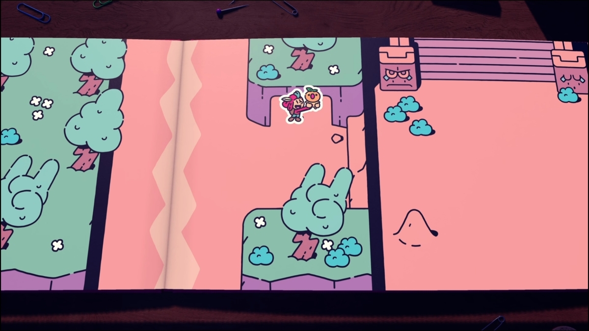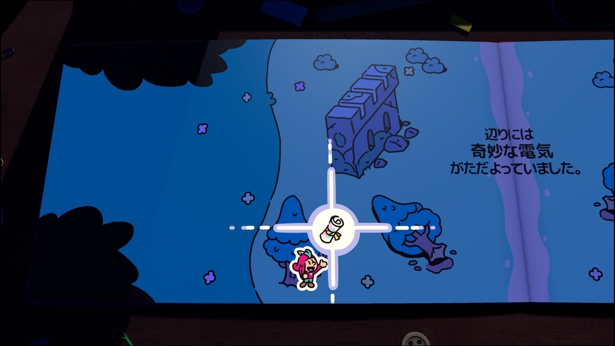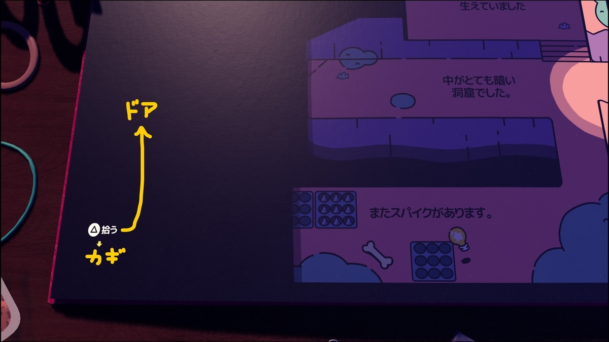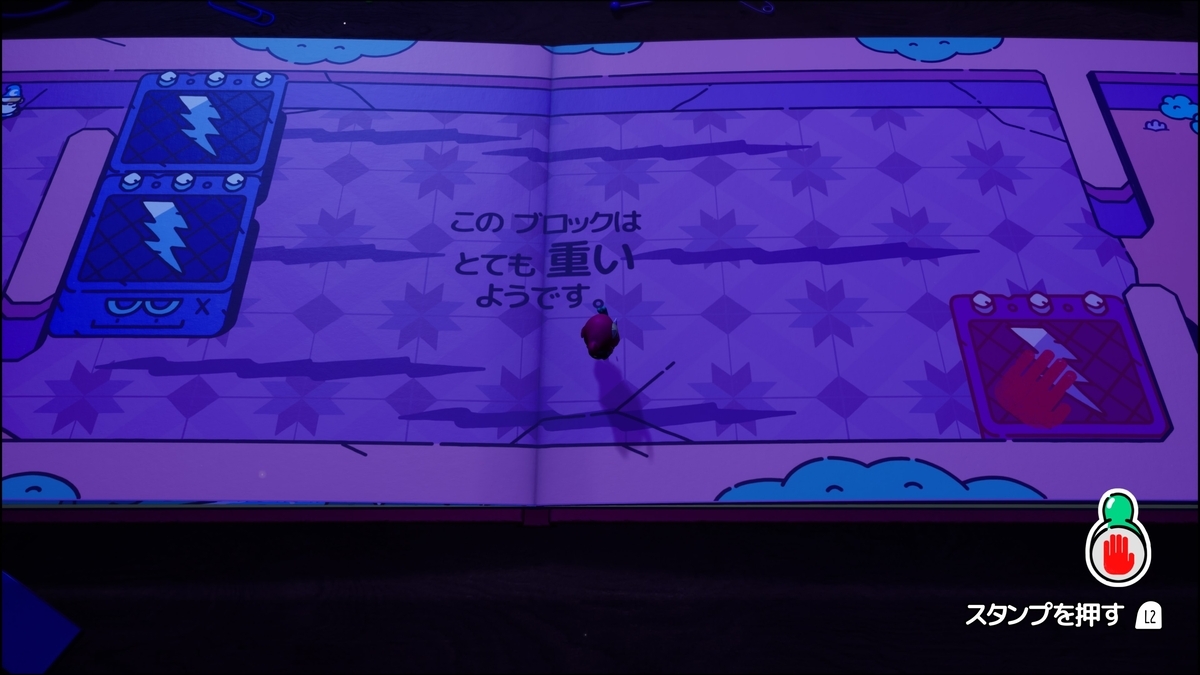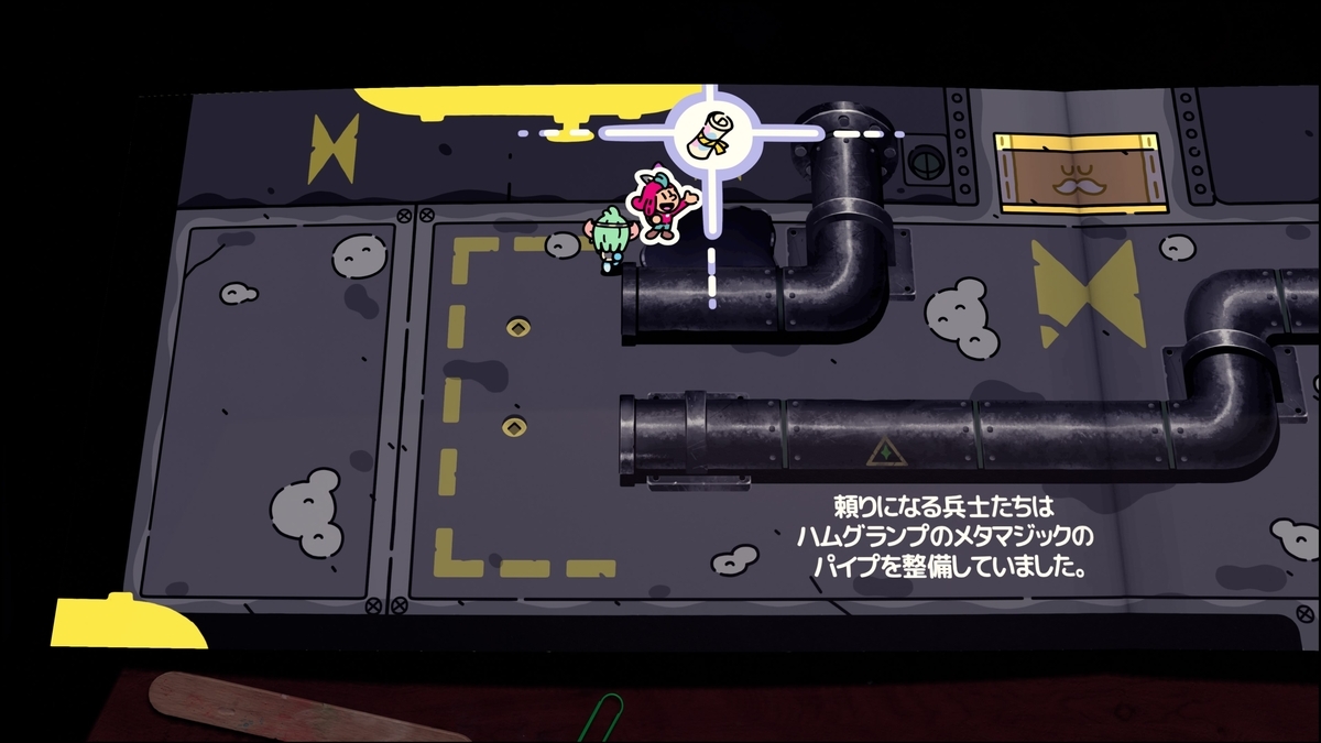 左のポータルから下へ行くと絵本がある、回転刃をスタンプで止めて絵本の中へ