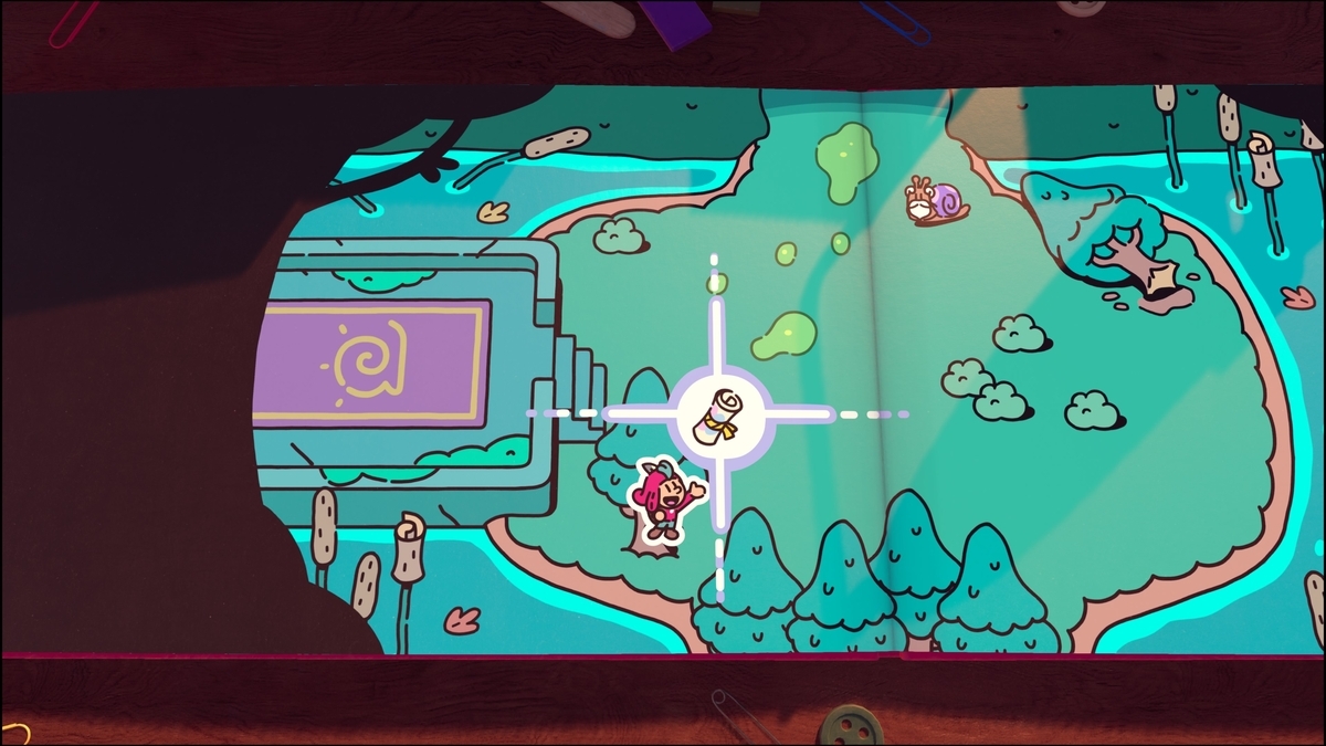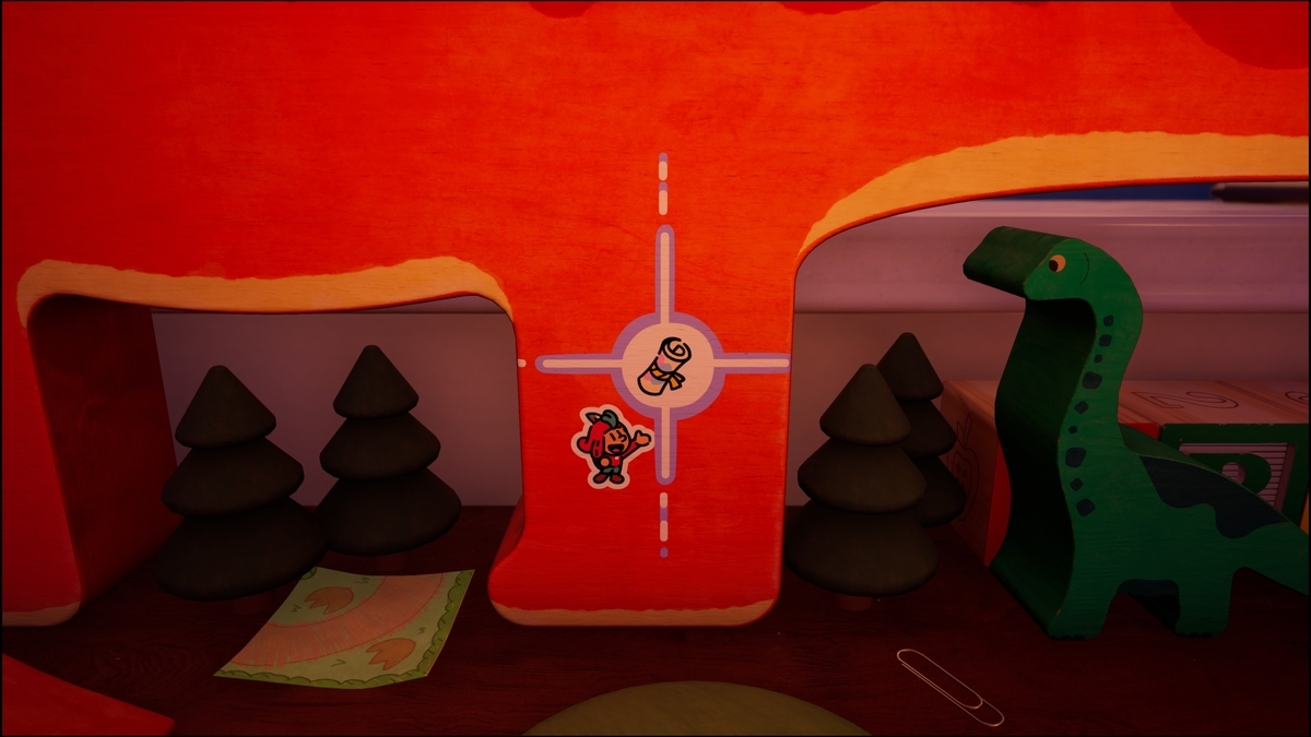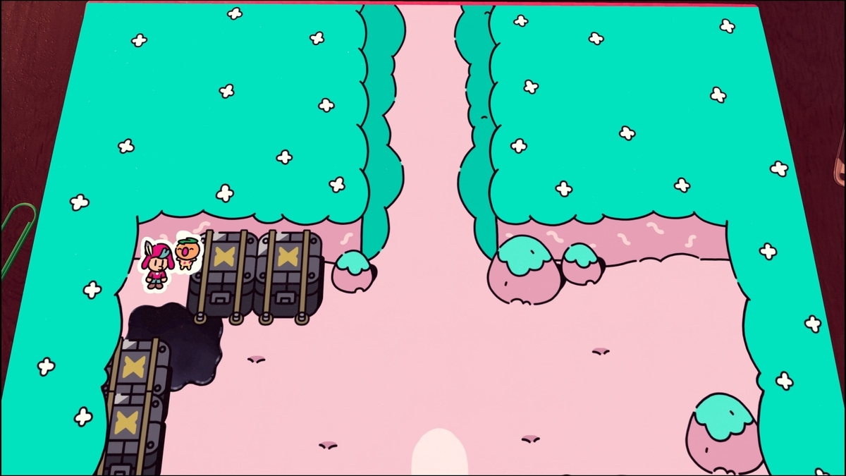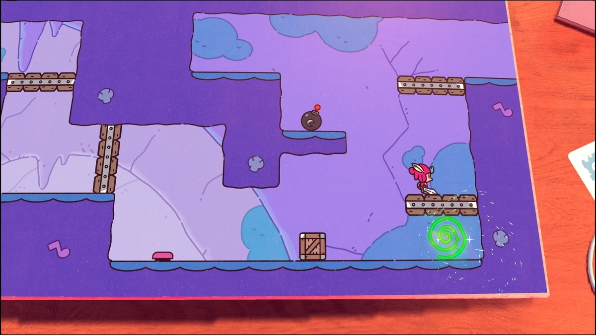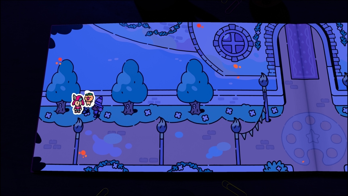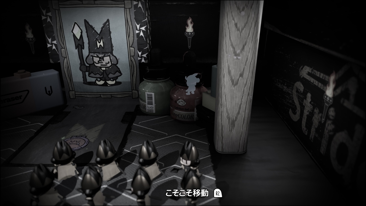 左のポータルから下へ行くと絵本がある、回転刃をスタンプで止めて絵本の中へ