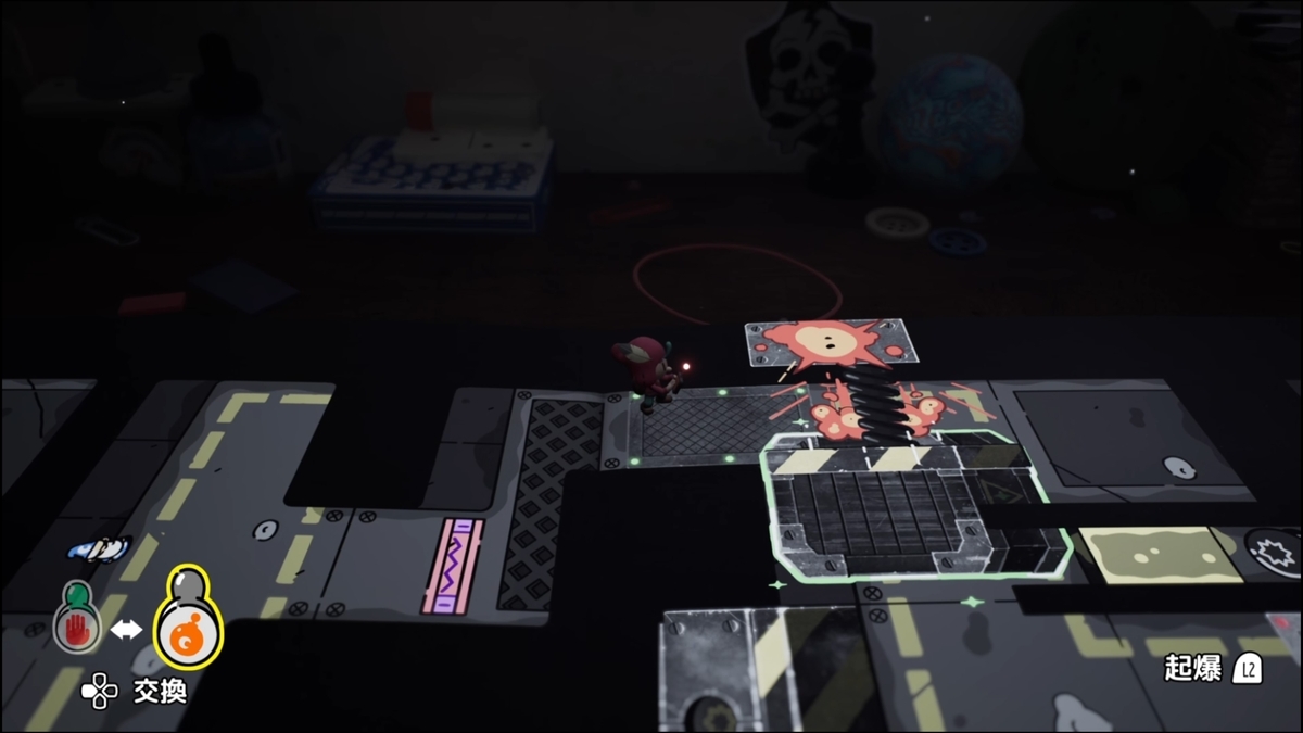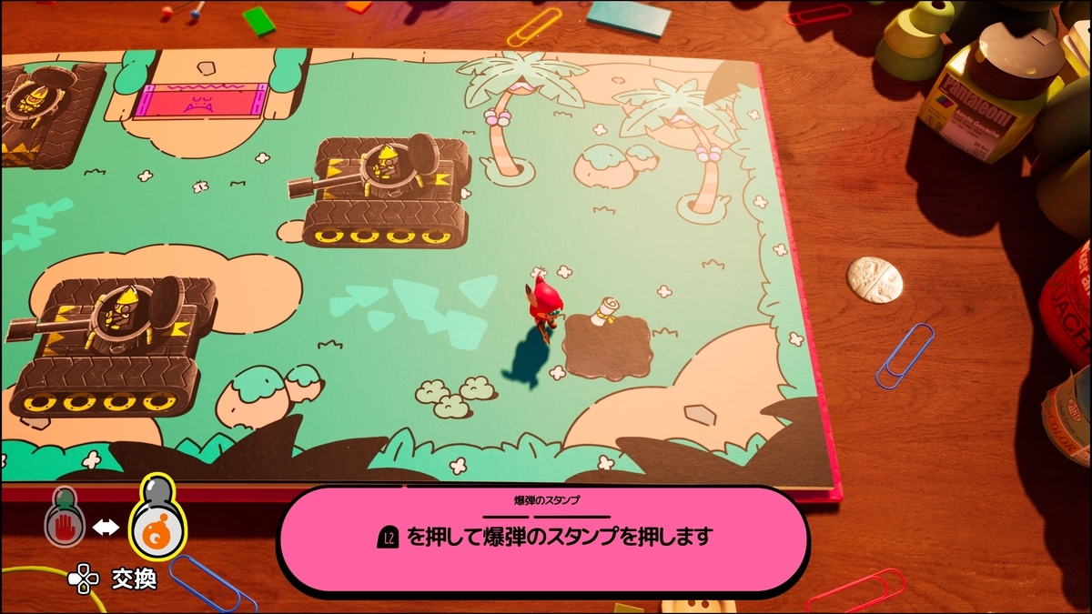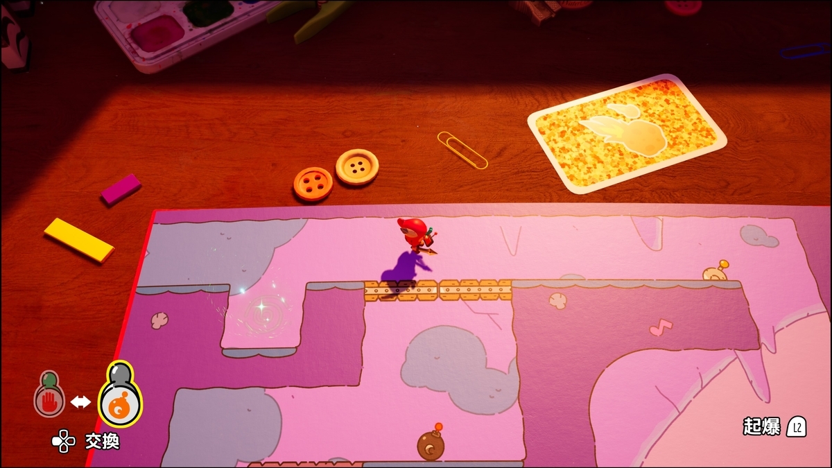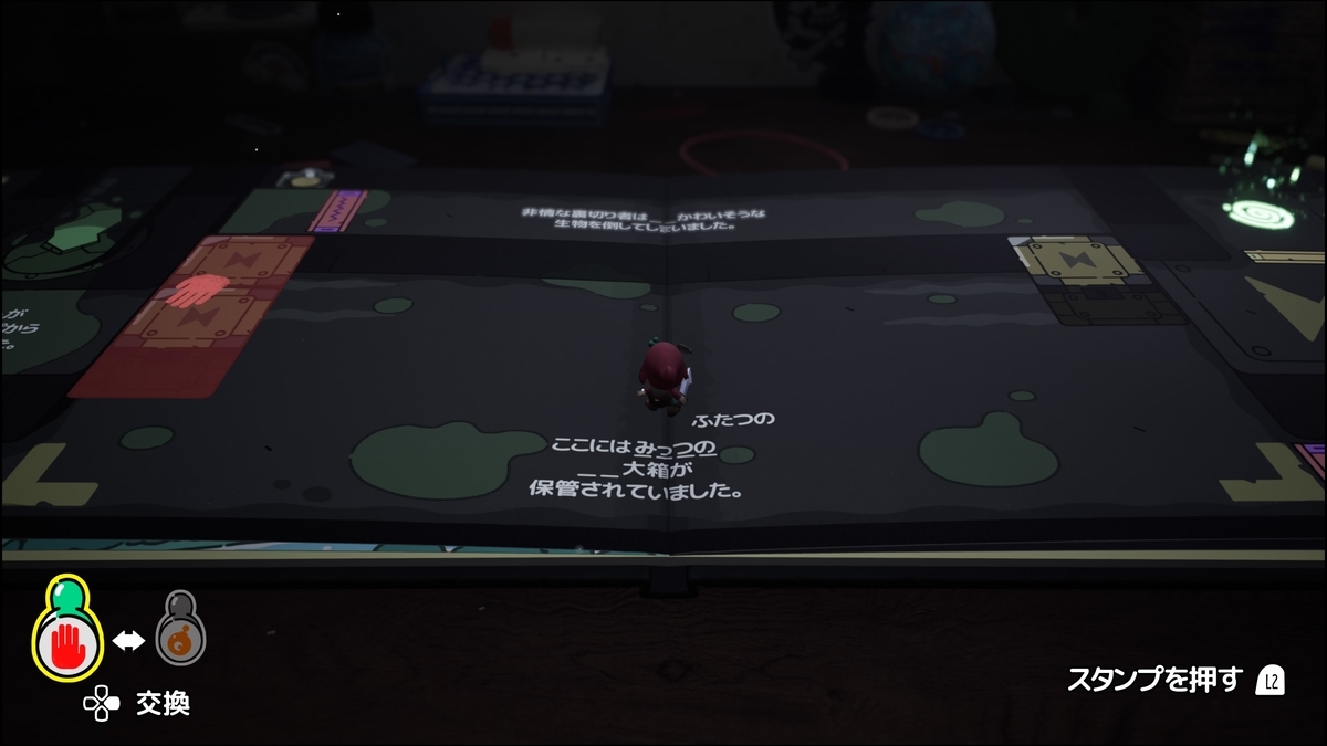 - 最初の段差上で爆弾スタンプを使い起爆すると爆弾が落ちてスイッチが固定される(読むのアクションで何にもないのはバグか?)