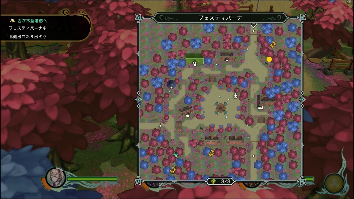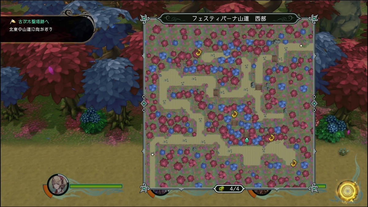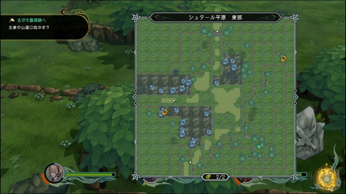 「蒼い宝箱」壊せる花を全て破壊すると北側の木々の間に蒼い宝箱が出現する。遠隔でやると状態異常にならずにいける