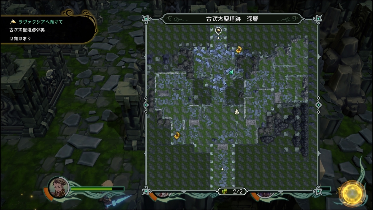 西側の2つの宝箱は、岩を決まった順番に破壊することで出現。剣>弓>槍>斧>拳>銃>双剣>杖