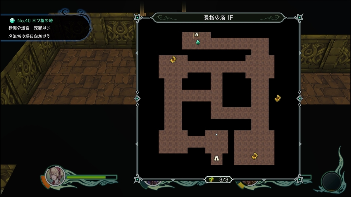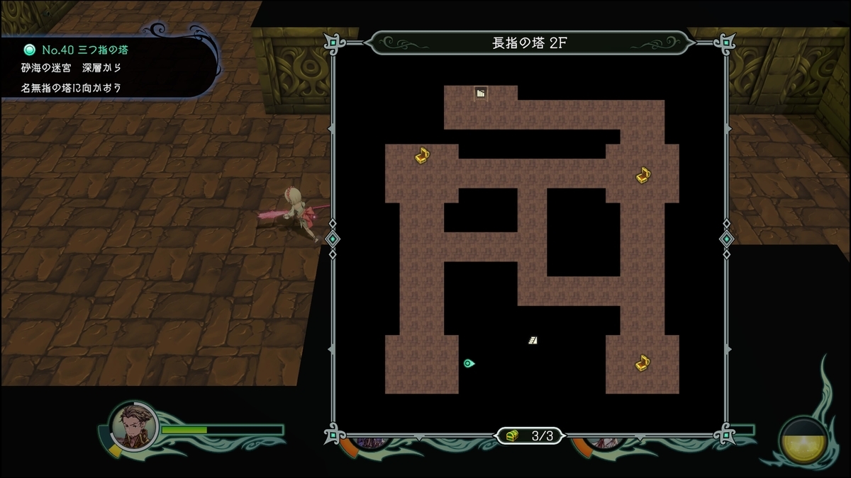 クエストNo.40「 三つの指の塔」で訪れる。砂海の迷宮深層の左側の出口から到達。このダンジョンは特殊で恐らく素材集め用のものだと思われる。至高系の素材等レシピVと経験値稼ぎなどに適している