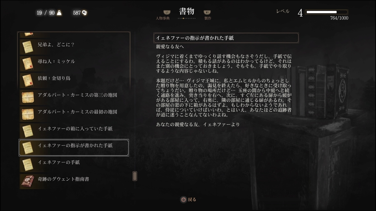 説明では「ヴィジマ城にあるイェネファーの部屋を訪れる必要がある」となっています。筆者は既にストーリーが進んでいる状態で受け取ったので所持品にダイレクトで入っていました。本来ならヴィジマ城初回訪問時になんらかの案内があるのかもしれません。