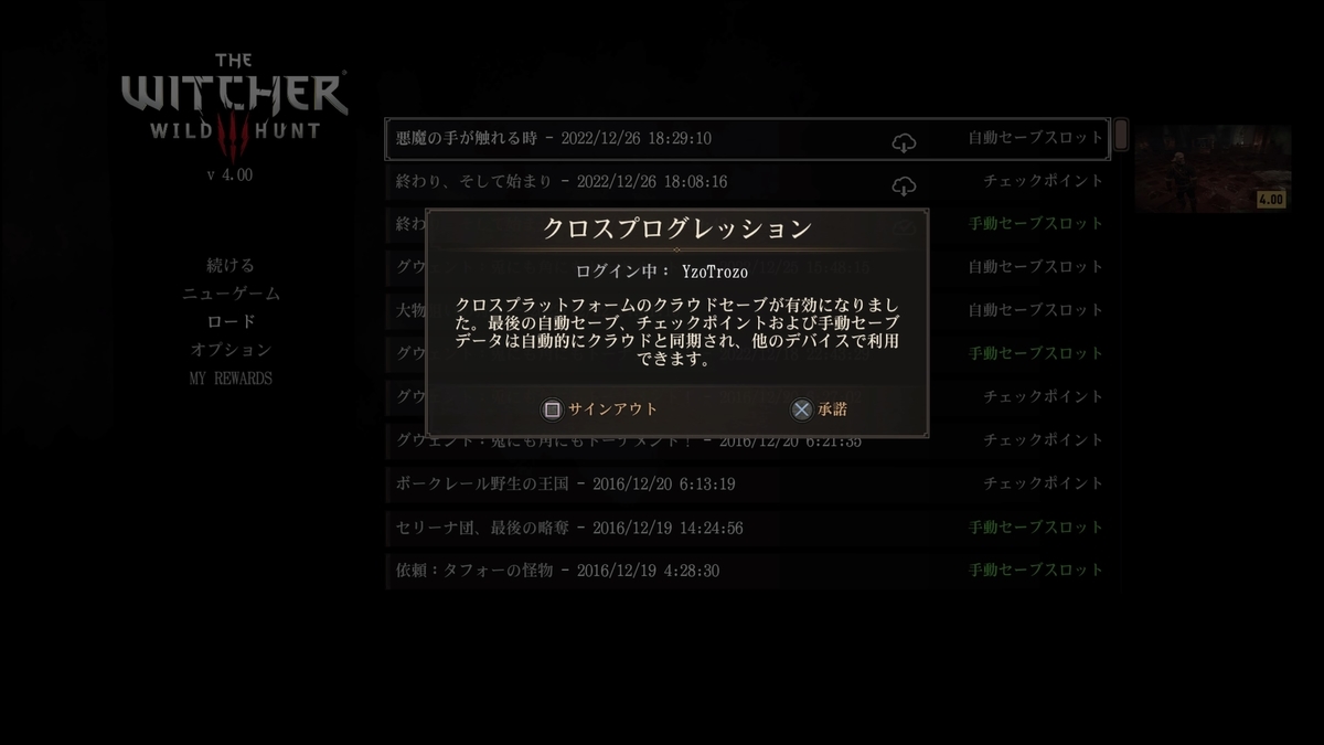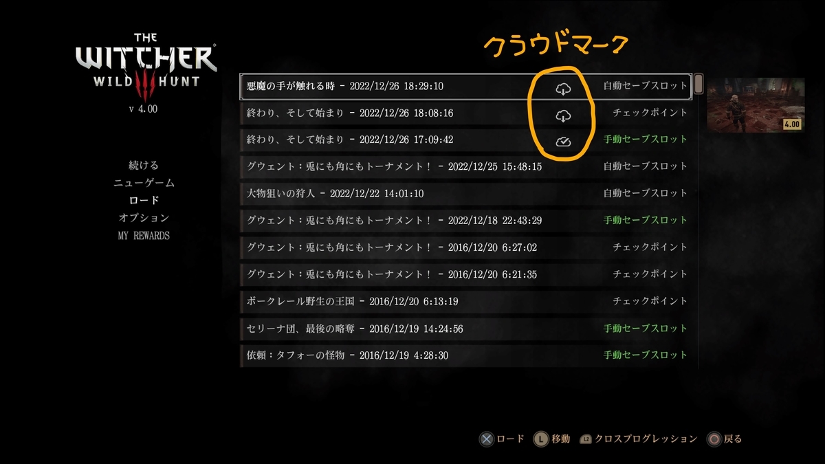 - サインインした状態で「ロード」メニューを開くと、状況により少し異なるのですがL2ボタンを押すことで「クロスプログレッション」のアナウンス(画像)と共に、「クラウド」アイコンがセーブデータに付きます(クラウドアイコンが付いたセーブデータが移行対象)。ここまでがPS4の作業になります